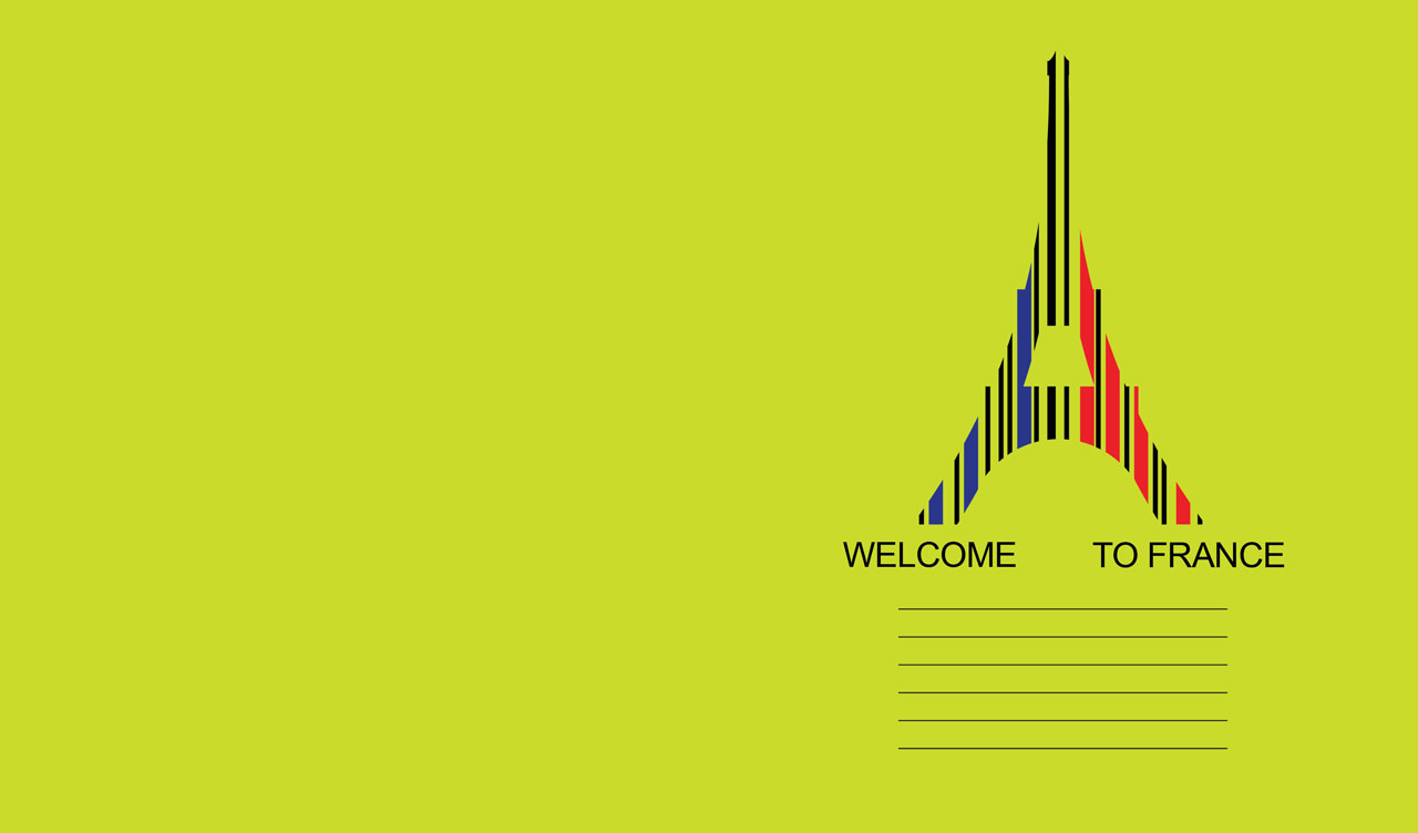A lime green invitation card to France decorated with a barcode art of the Eiffel tower in Paris.