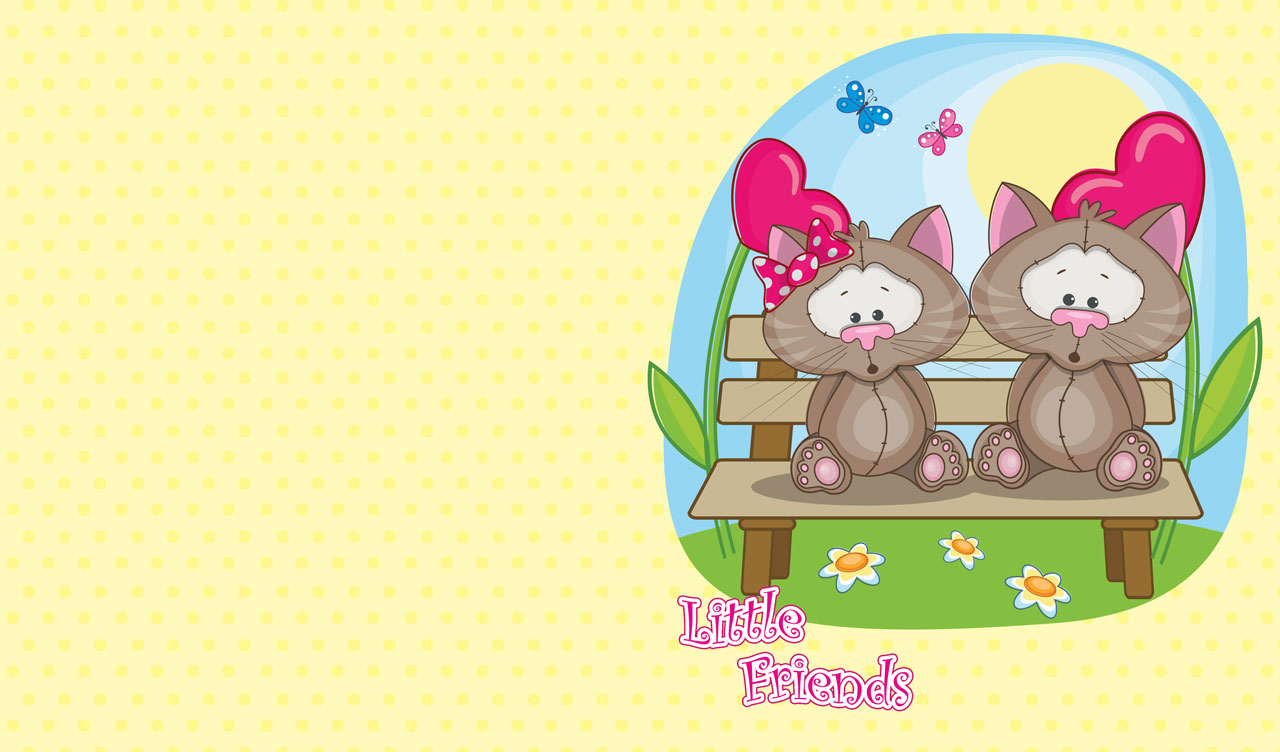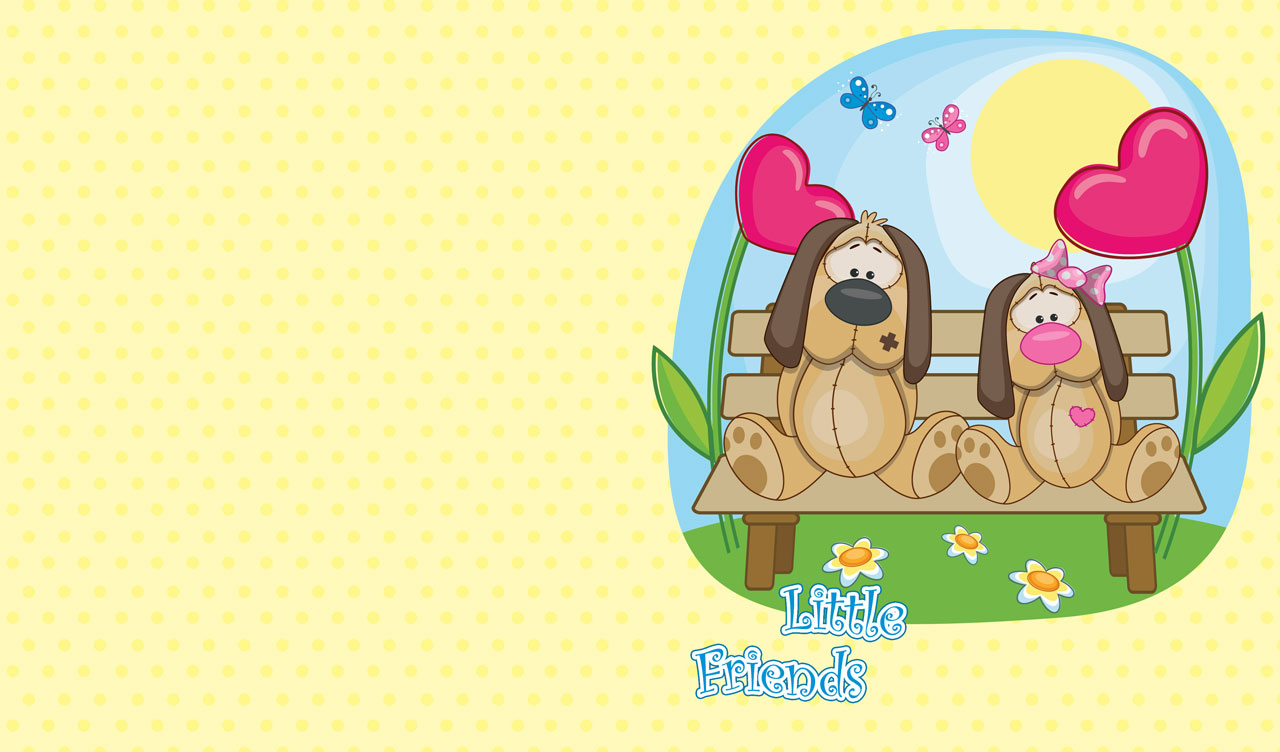 1. Cartoon doggies on a bench with heart shaped pink flower on pastel yellow 2. Cartoon kittens on a bench with heart shaped pink flower on pastel yellow 3. Cartoon hedgehogs on a bench with heart shaped pink flower on pastel yellow 4. Cartoon bunnies on a bench with heart shaped pink flower on pastel yellow