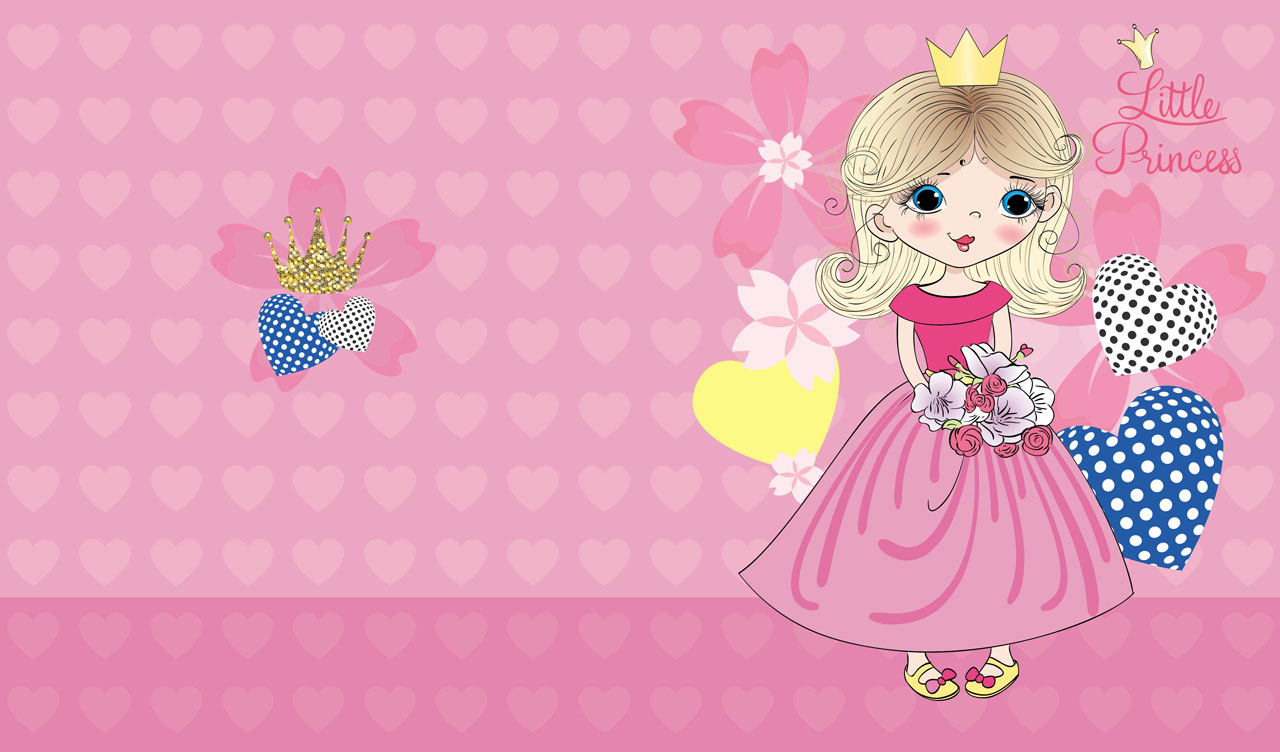 5. Little blonde princess with a bouquet on a pink heart patterned backdrop