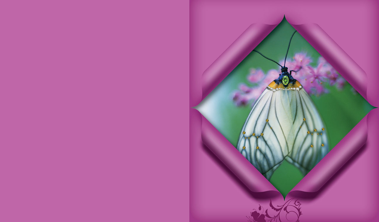 1. Close-up of a white butterfly with green gem and folded wings in a hot pink rhombus frame
