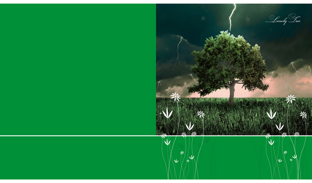 1. A lonely tree in a green field struck by a lightning against a green backdrop 2. A lonely heart shaped tree in an orange blooming field against a red backdrop 3. A lonely green tree on a rock ledge on a cloudy night against a blue backdrop 4. Sawn into pieces lonely tree levitates in an autumn field against an orange backdrop