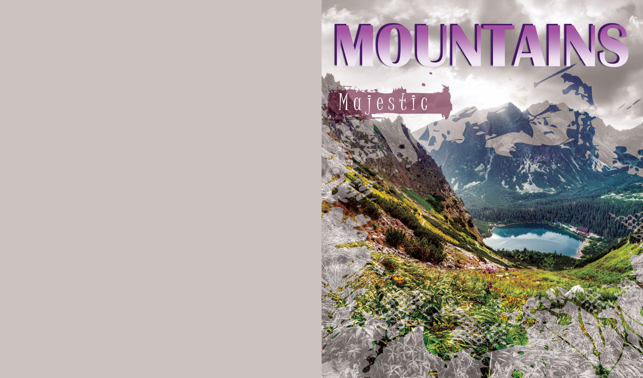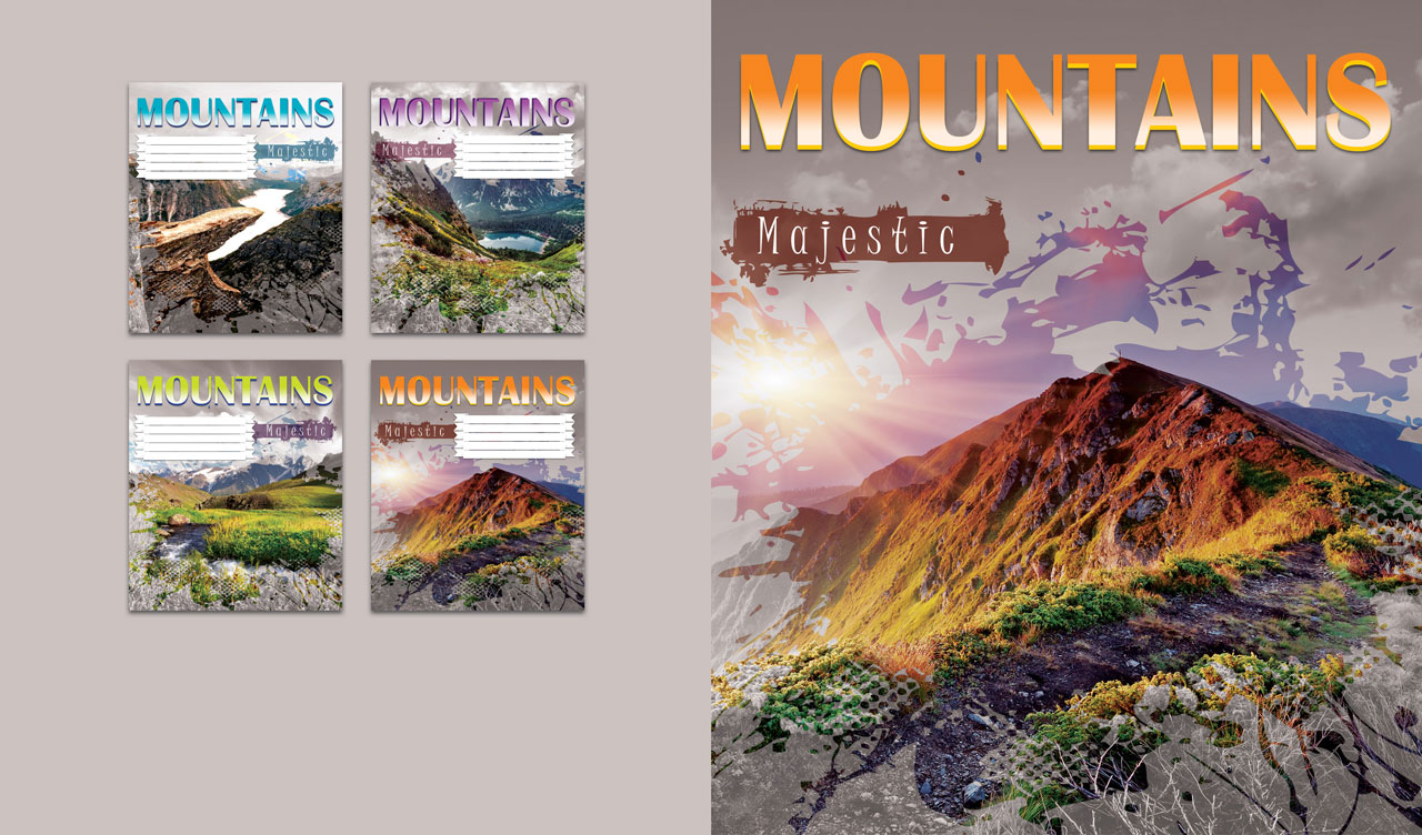 1. Creek and glade against the backdrop of majestic mountains on pastel gray 2. White lake and cliffs against the backdrop of majestic mountains on pastel gray 3. Green slope and a lake against the backdrop of majestic mountains on pastel gray 4. Rusty majestic mountain against the backdrop of a purple sunrise on pastel gray