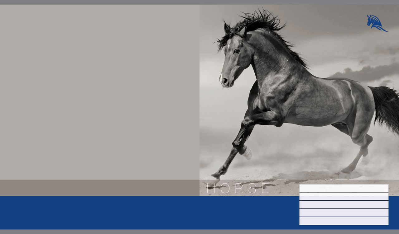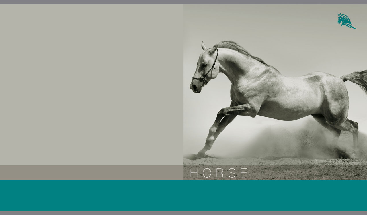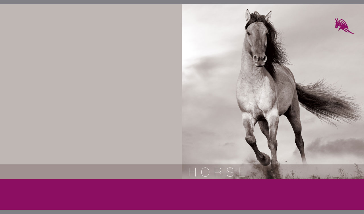 1. Monochromatic shot of a horse kicking up dust on a light gray and teal backdrop 2. Monochromatic shot of a pair of white horses on a light gray and orange backdrop 3. Monochromatic shot of a black purebred horse on a pastel gray and red backdrop 4. Monochromatic shot of a light horse in the wind on a gray and purple backdrop 5. Monochromatic shot of a black-maned horse on a gray and blue backdrop