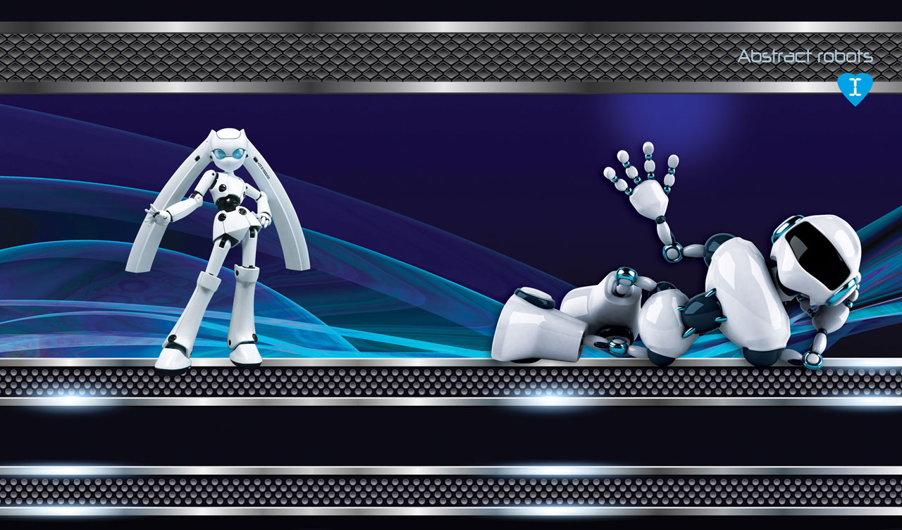Black and white male and female robots posing on a black-navy backdrop with abstract blue waves in a metallic punched pattern frame.
