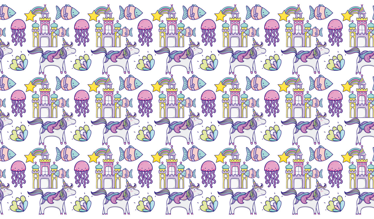 3. A cartoon seamless pattern with palaces, unicorns, and jellyfish on white