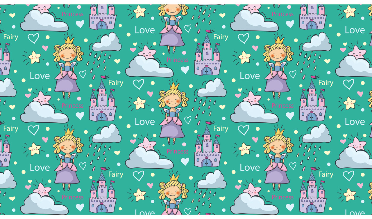 4. A cartoon seamless pattern with princesses, castles, and rainy clouds on teal