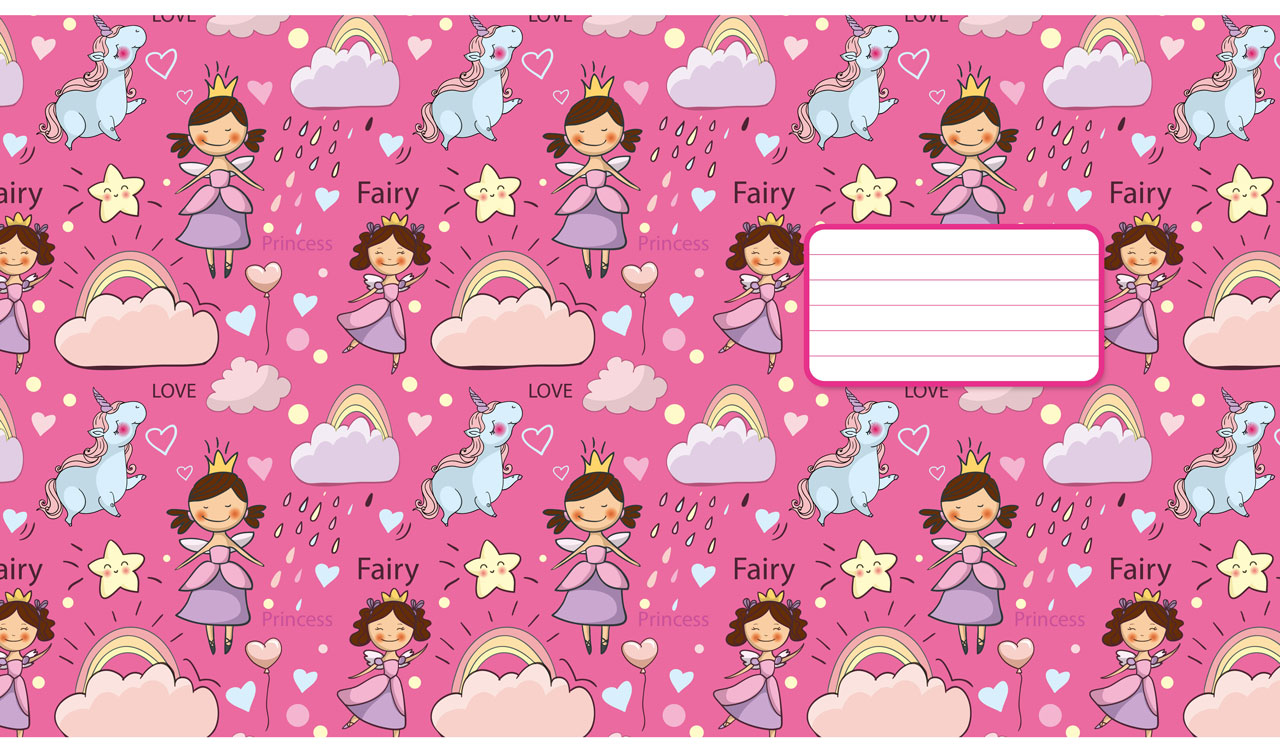 5. A cartoon seamless pattern with princesses, unicorns, and rainbow clouds on pink