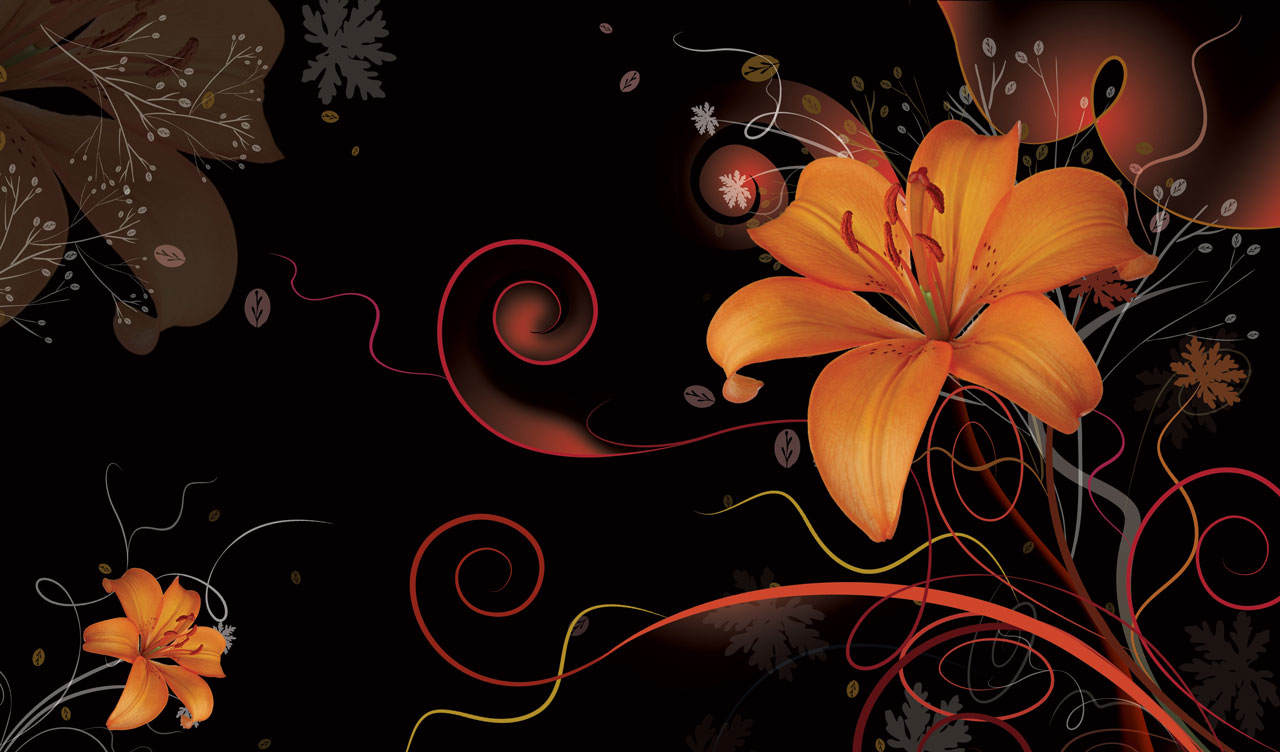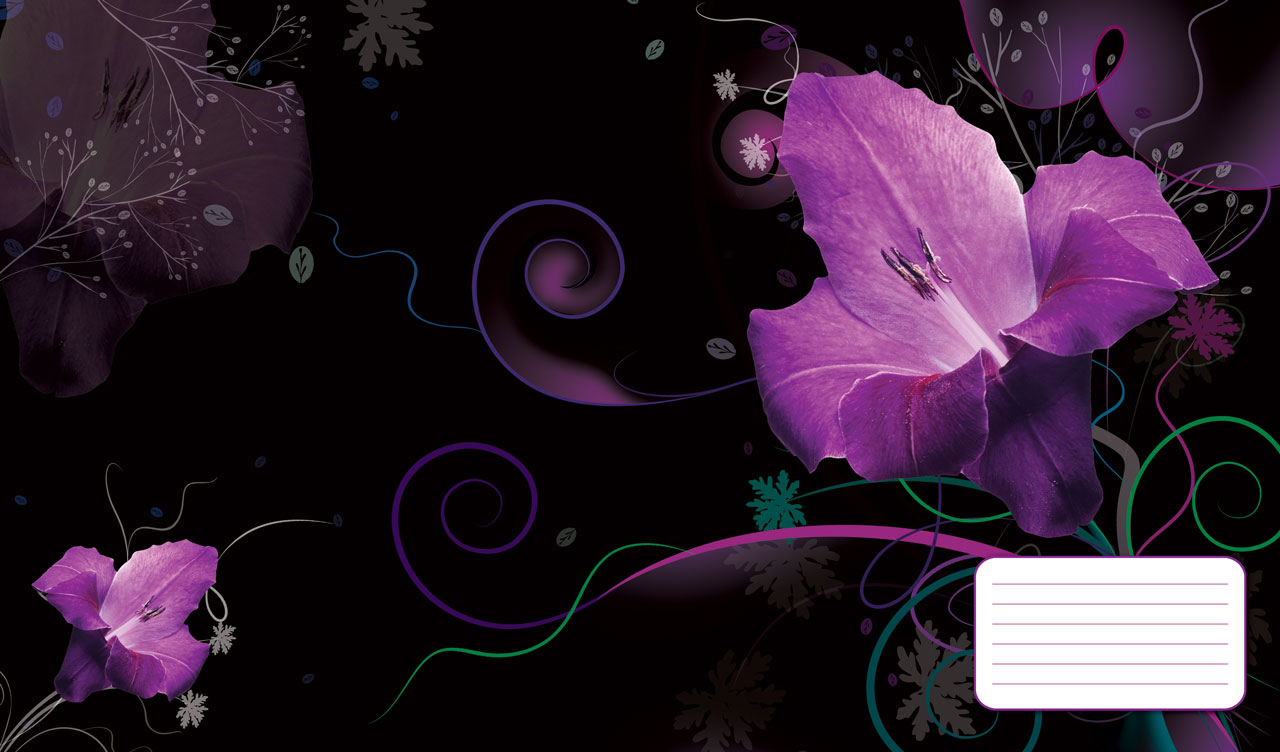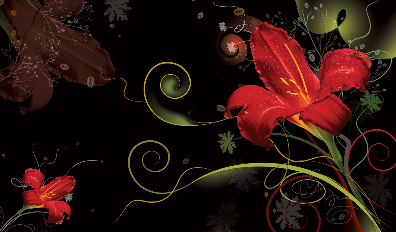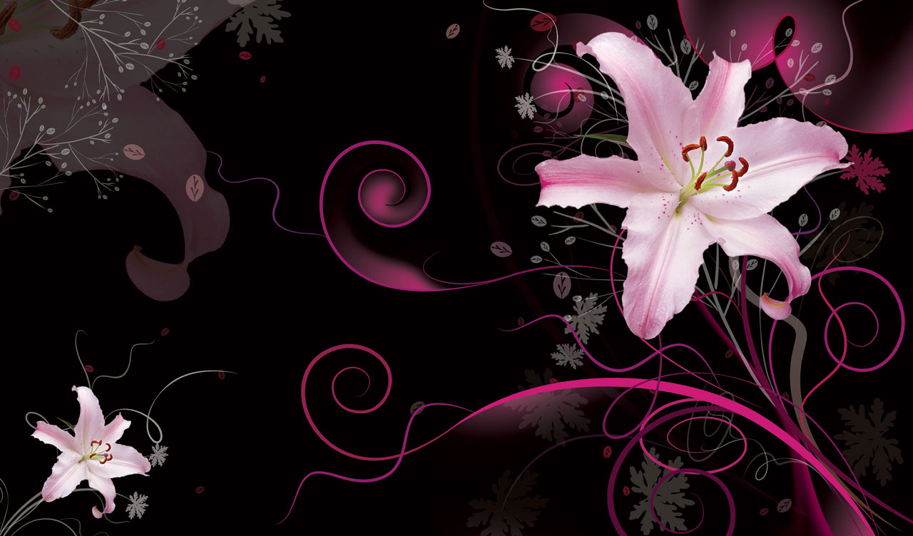 1. Vibrant orange lily contrasts with black background of red floral patterns 2. Pastel pink lily contrasts with black background of purple floral patterns 3. Scarlet red lily contrasts with black background of green floral patterns 4. Violet gladiolus contrasts with black background of purple floral patterns