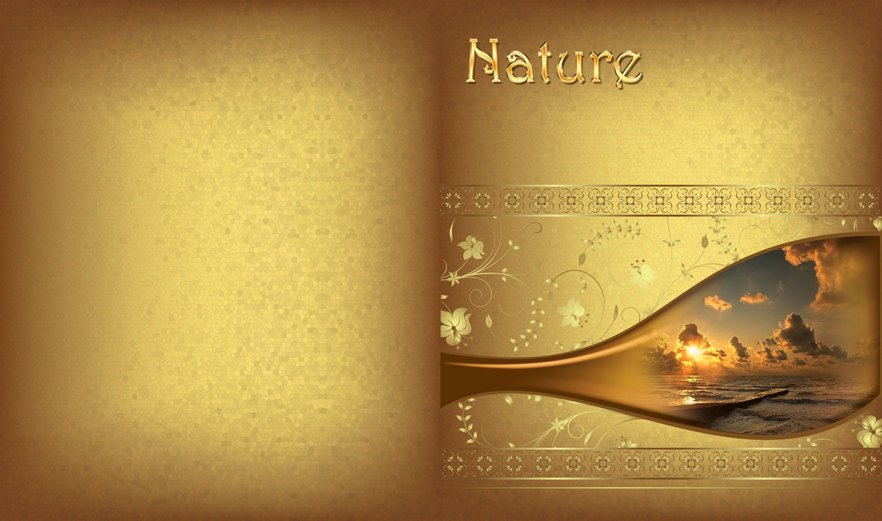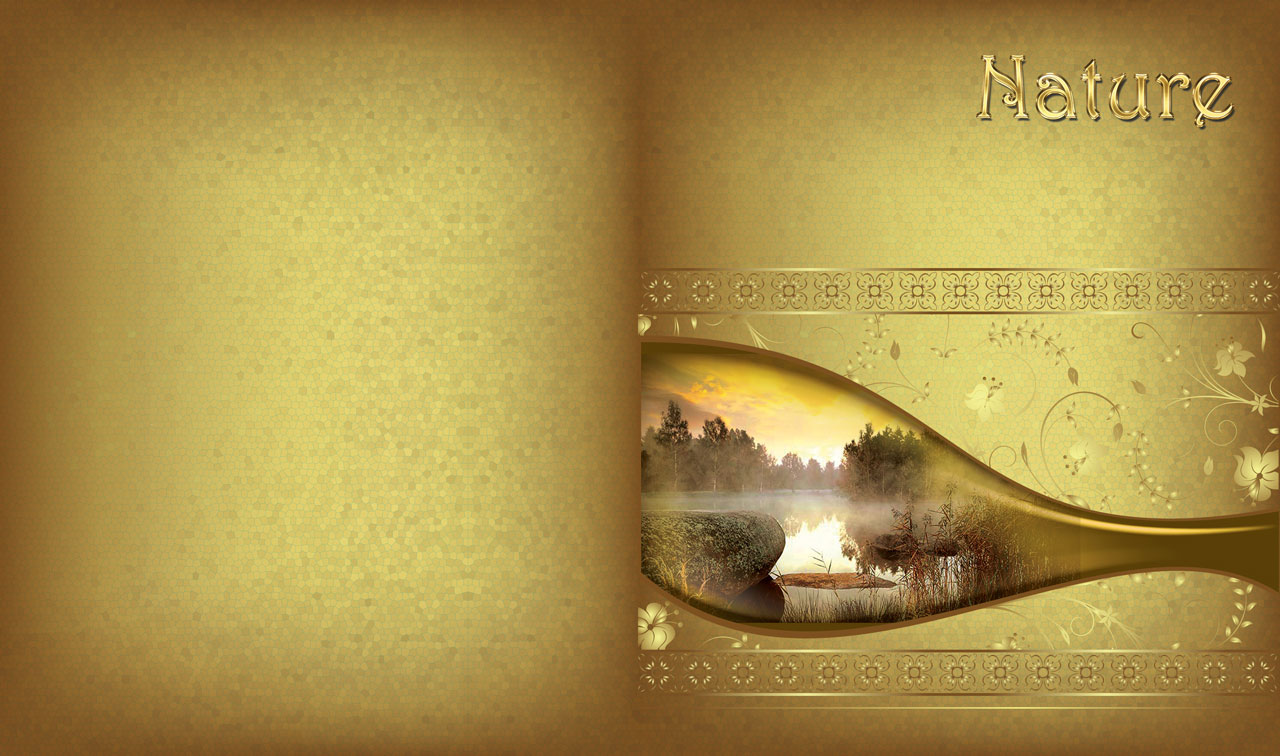 1. Water drop miniature of a foggy forest lake with a boulder in front 2. Water drop miniature of a golden sunset on the sea with beautiful clouds 3. Water drop miniature of a golden dawn over a meadow, river and trees upfront 4. Water drop miniature of a quiet lake with clouds and beautiful nature