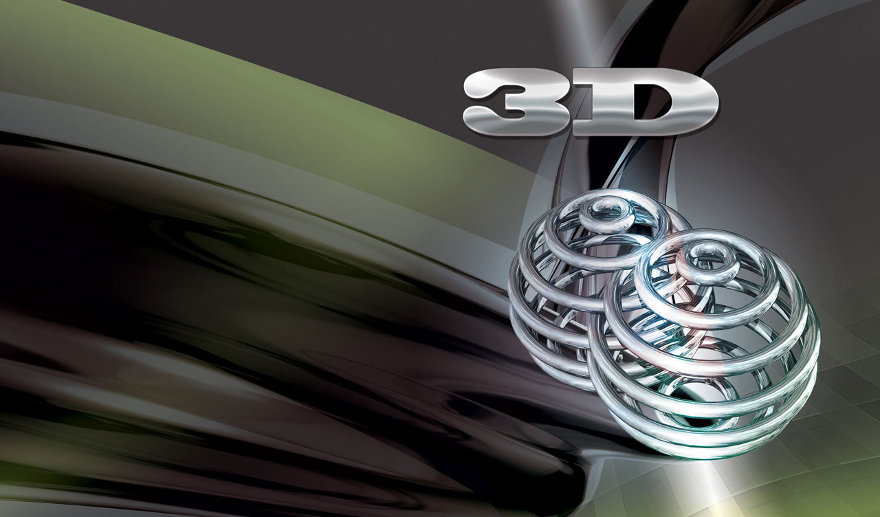 Modern smart 3D illustration of two spheres made up of silver rings reflecting light against an abstract grey and green background with swooshing lines.
