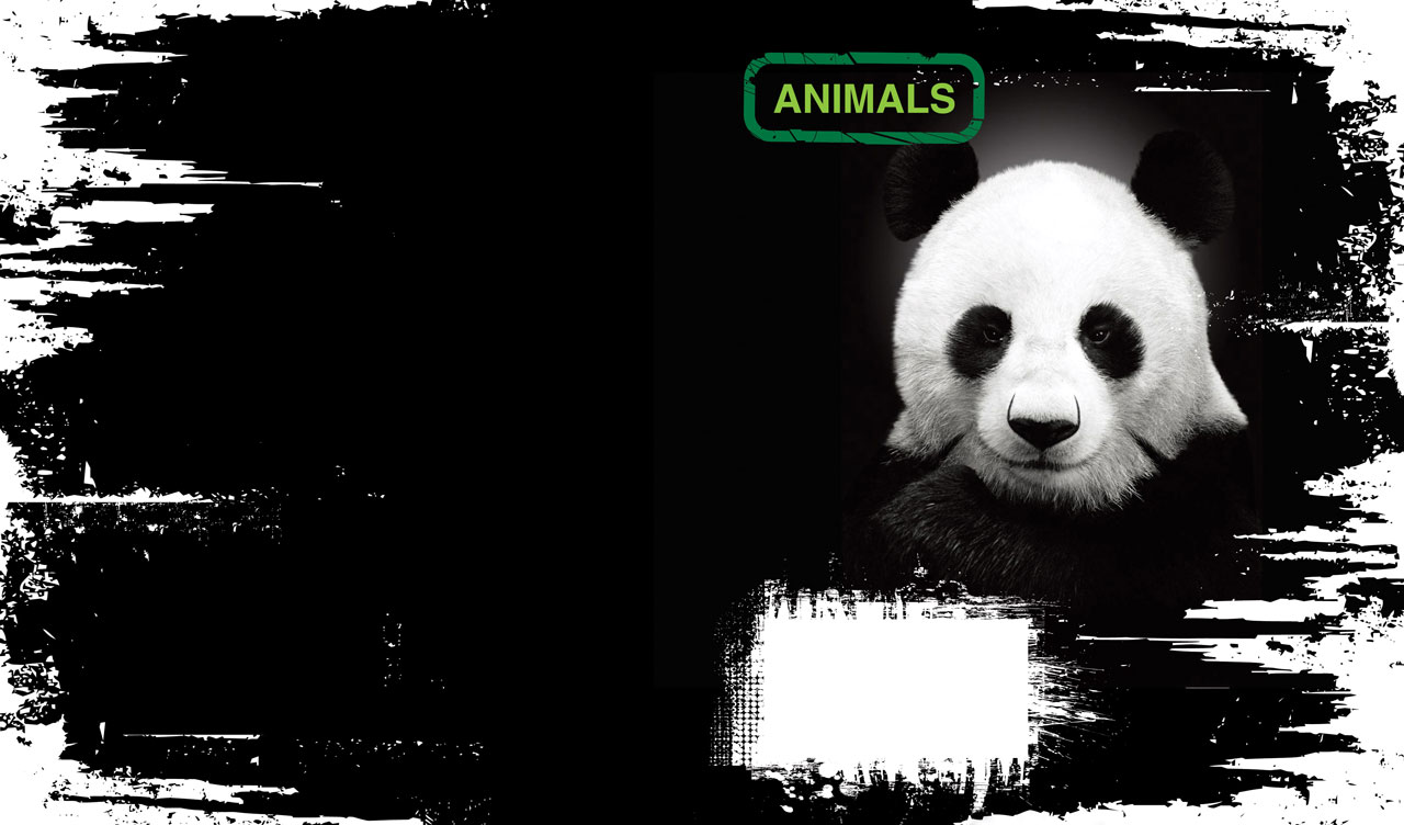 1. A portrait of a gorgeous lion on black-and-white grunge design background 2. A portrait of a mysterious owl on black-and-white grunge design background 3. A portrait of a lovely panda on black-and-white grunge design background 4. A portrait of a smiling dolphin on black-and-white grunge design background