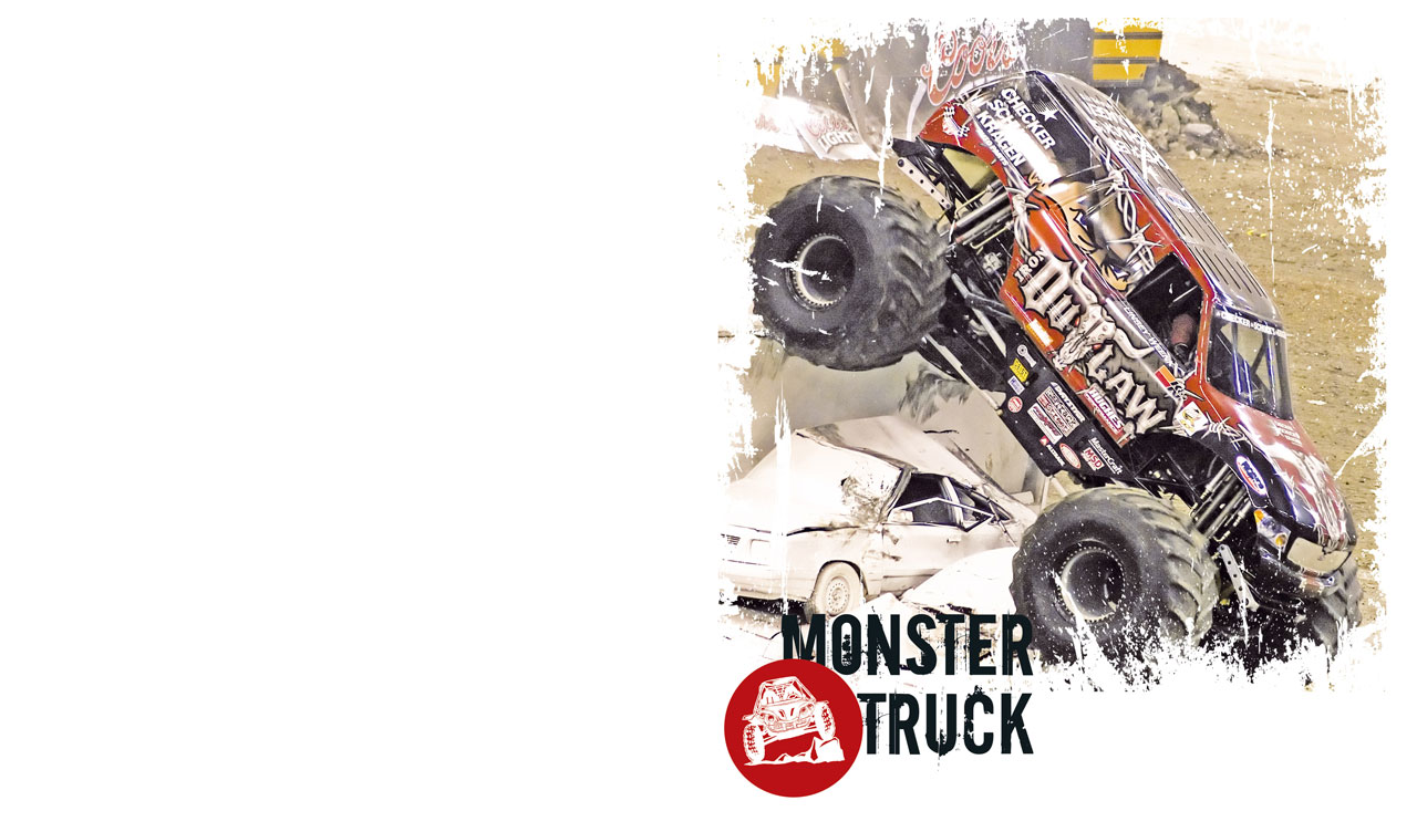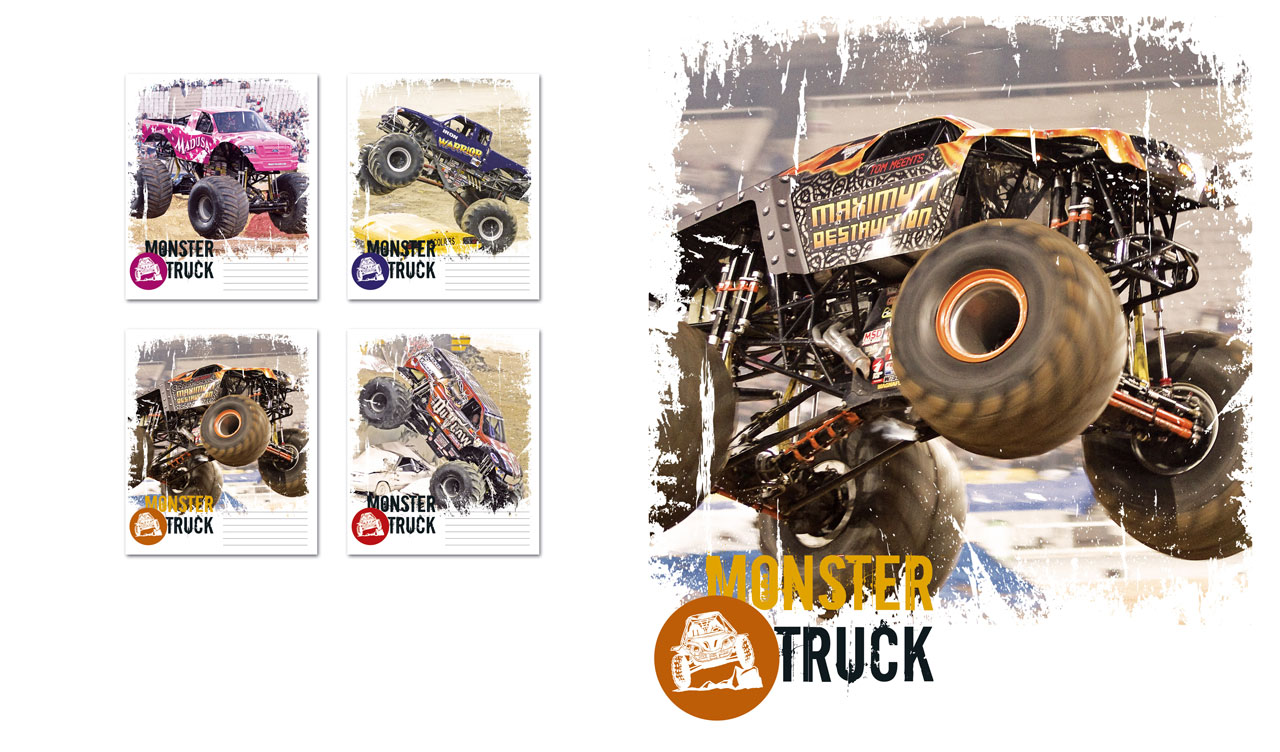 1. Shabby photo of a red Iron Outlaw Monster Truck with grunge edges on white 2. Shabby photo of a dark blue Iron Warrior Monster Truck with grunge edges on white 3. Shabby photo of a yellow-red Warrior Monster Truck with grunge edges on white 4. Shabby photo of a purple-pink Medusa Monster Truck with grunge edges on white 5. Shabby photo of a Maximum Destination Monster Truck with grunge edges on white