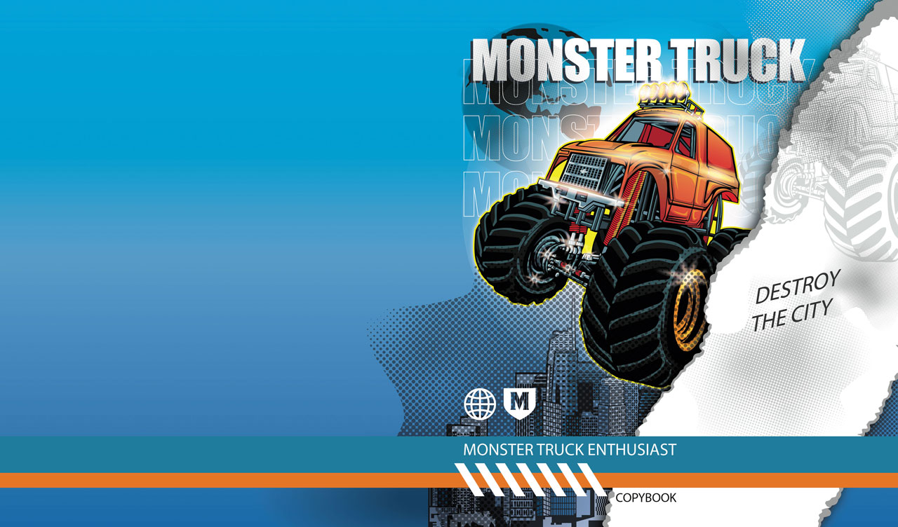 4. Monster truck soaring over a cityscape on navy and red gradient