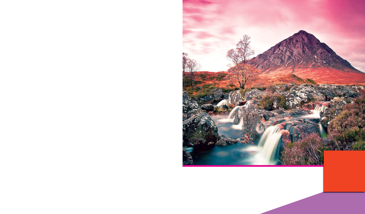 1. Elevated view of a mountain forest by a lake in a frame on a white background 2. A lonely mountain and a stream in purple-red tone in a frame on a white backdrop 3. A gurgling stream flowing along golden mountain in a frame on a white background 4. A view of a mountain village from the water in a frame on a white background