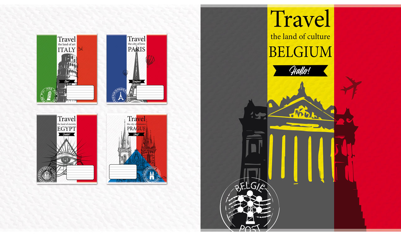 1. Stylized French travel poster with the Eiffel Tower and a Paris seal on white 2. Stylized Italian travel poster with the Leaning Tower and a Pisa seal on white 3. Stylized Egyptian travel poster with Eye of Horus on pyramid on white 4. Stylized Czech travel poster with Prague Castle and a Prague seal on white 5. Stylized Belgian travel poster with the Place de la Bourse and a seal on white