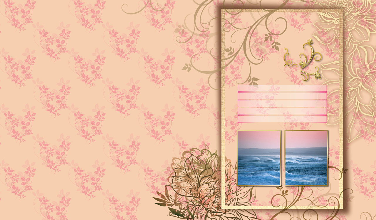 2. Two miniatures of storm sea waves on pink, golden and beige floral pattern