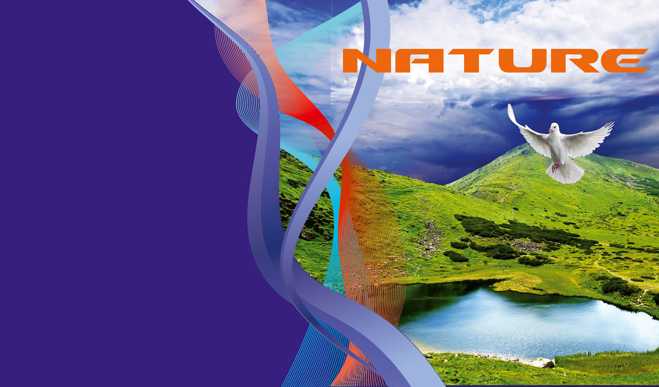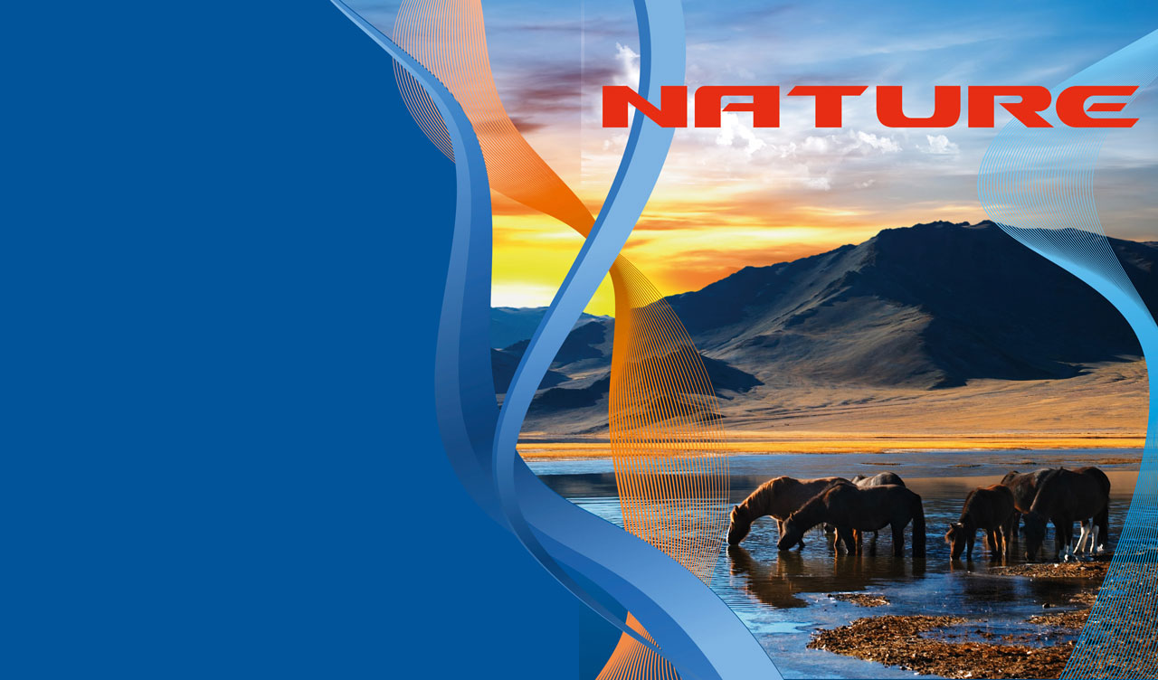 1. White gull by the calm sunset sea on a blue orange background 2. Horses drinking water at a black mountain on a blue background 3. White pigeon soaring over lake with green hills on a violet blue background 4. Black head gull by the water on a sunset stone beach on a violet orange background
