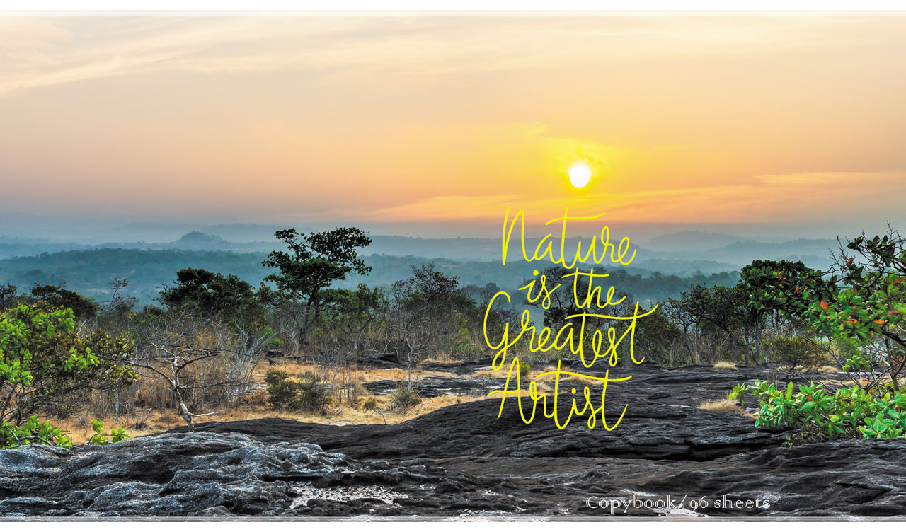 1. Panoramic scenery with bare baobab trees against an orange-red sunset sky 2. Panoramic scenery with rock holes at Kaeng Sam Phan Bok Grand Canyon 3. Panoramic scenery of lava field in the Guiana Amazonian Park at yellow dawn 4. Panoramic scenery of massive rocks in the Atlantic Ocean at orange sunset 5. Panoramic desert scenery set against a mountain range at a yellow-pink dawn