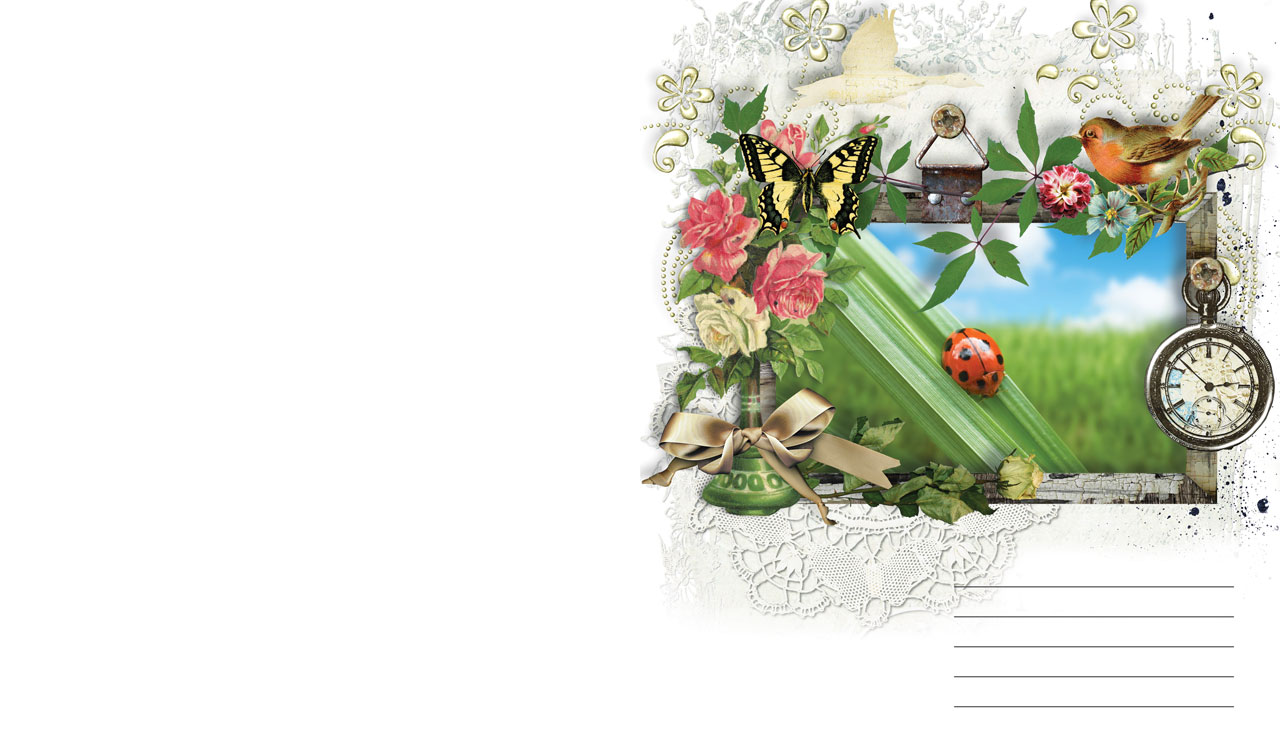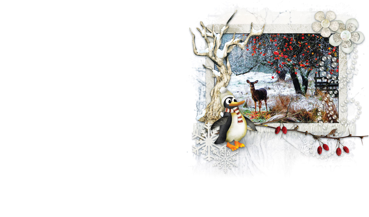 1. Carnation and narcissus in grass in front of a pink tree in frame of sticks 2. Peonies and fern leaf on top of an image of a flying stork above a river 3. Deer under a red apple tree in snow in frame of penguin, flowers and snowflakes 4. Ladybug on grass in a frame with a robin, butterfly, roses and pocket watch
