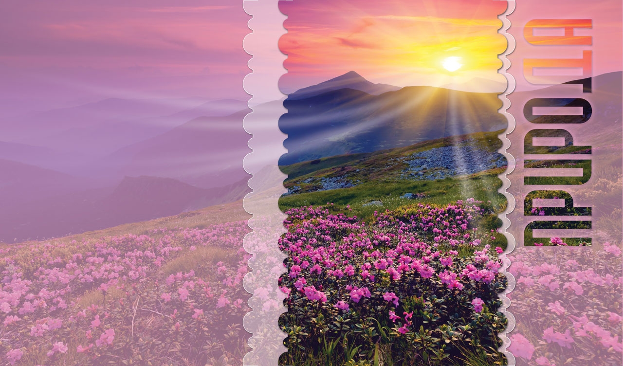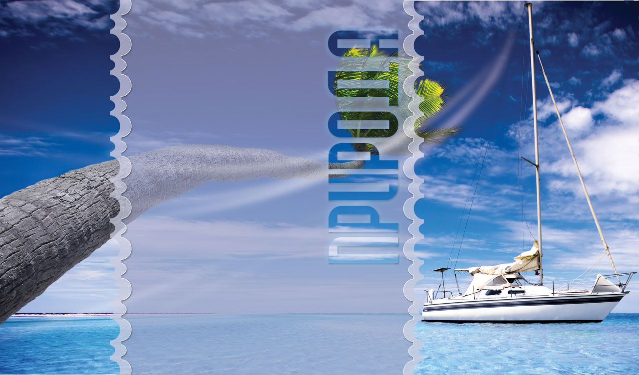 1. Sun rises behind dark mountains shining over green and pink wildflower meadow 2. A white boat in the endless blue sea floats near a palm tree on a sunny day 3. Cascading waterfall in a peaceful autumn forest of red and green trees 4. Ocher autumn forest and the grey clouded sky reflected in the waters of the lake
