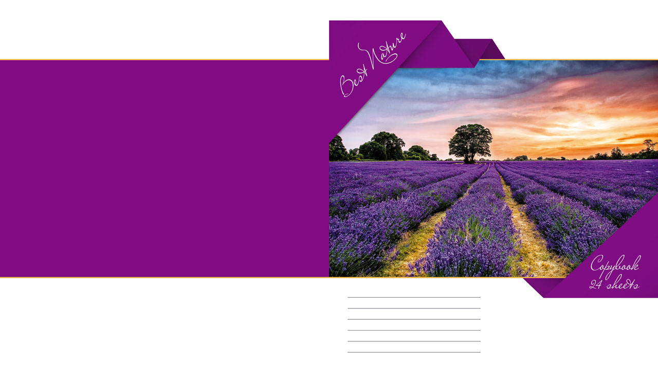 1. Overcast autumn riverscape in an ocher ribbon frame and a white backdrop 2. Green summer riverscape at sunset in a green ribbon frame and a white backdrop 3. Ocean dawn on the rocky shore in a blue ribbon frame and a white backdrop 4. Sunset in a lavender field in a purple ribbon frame and a white backdrop 5. Birds fly over the sunset beach in a red ribbon frame and a white backdrop