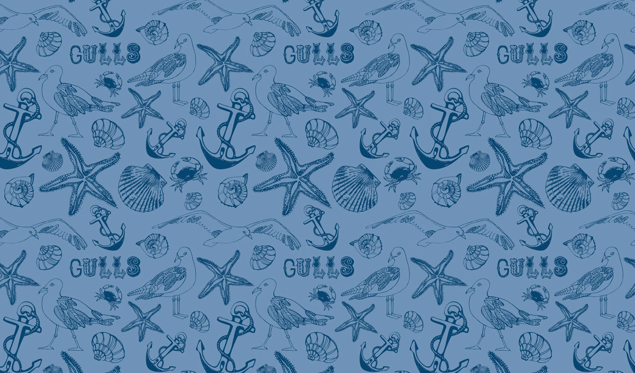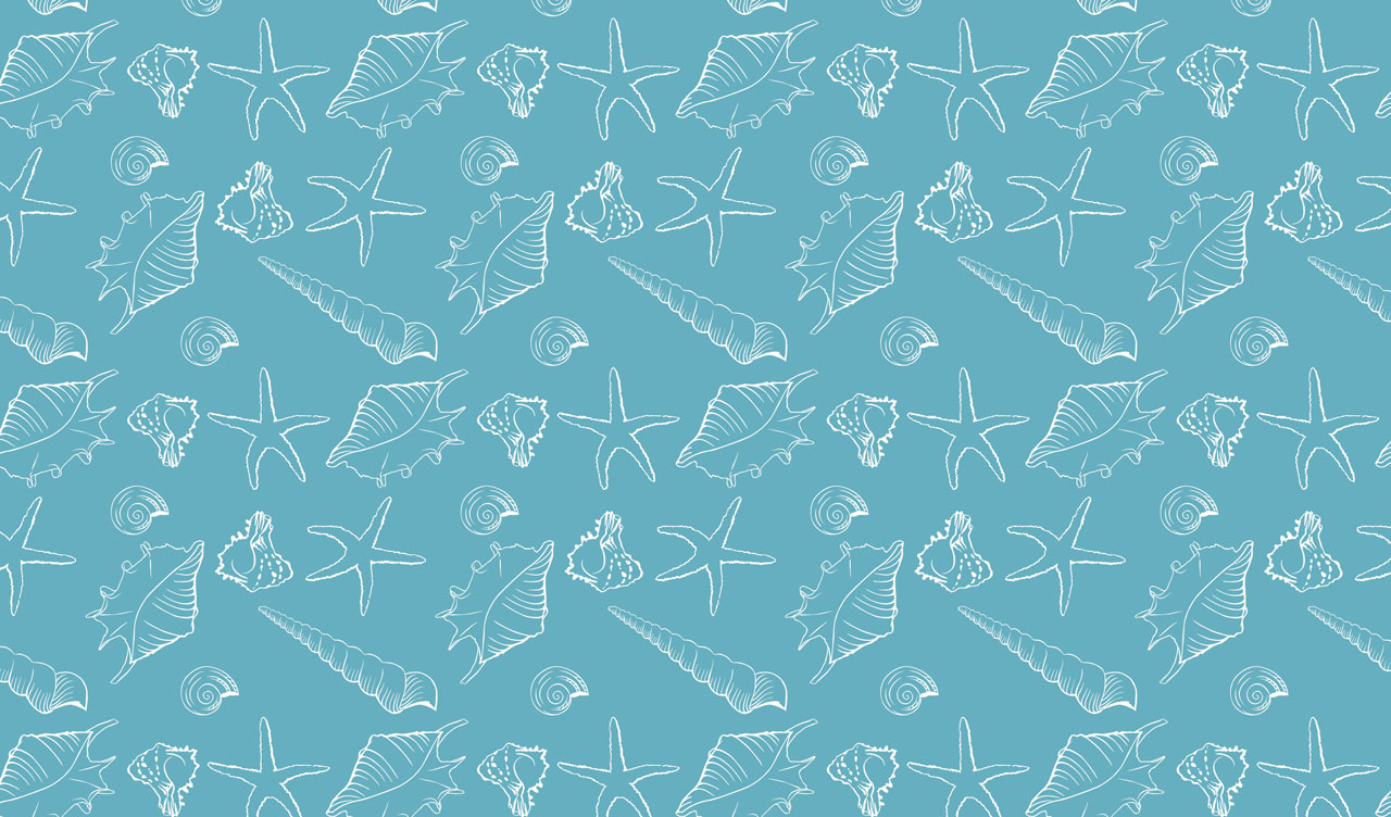 1. Abstract seamless pattern with shells and starfish against a teal backdrop 2. Abstract seamless pattern with gulls, anchors and shells against a blue backdrop 3. Abstract seamless pattern with white molecules against a violet backdrop 4. Abstract seamless pattern with dark green leaves against a green backdrop