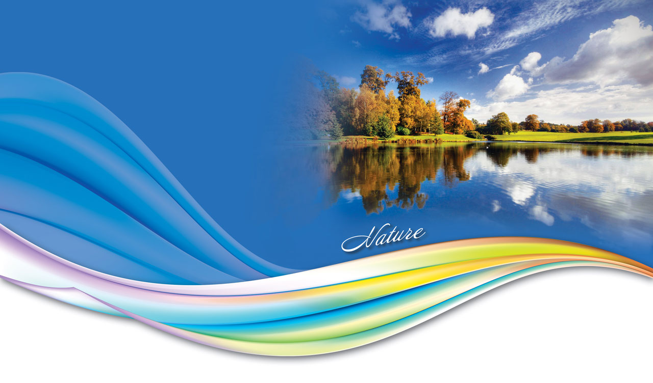 1. Blue lake against a green lawn in a golden forest on white and blue background