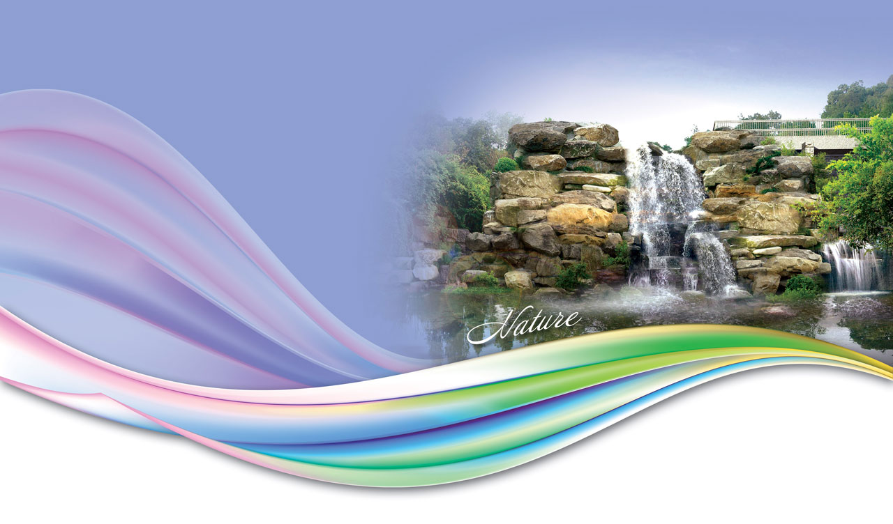 2. Stone waterfall at footbridge against the white and pastel blue background