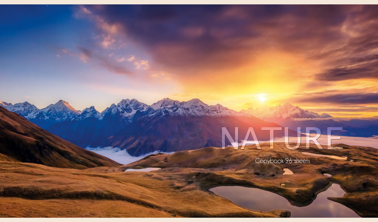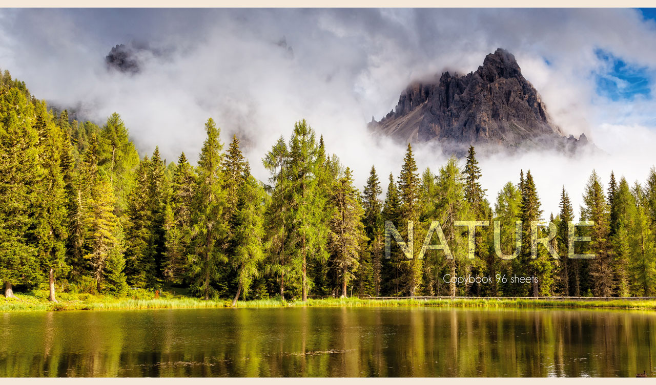1. Snowy mountain peaks enveloped in fog and a lakeside scene at the golden hour 2. Fir trees and yellow haystack on a hazy foothill field in the daylight 3. Calm lake, green spruces and a rocky hill shrouded in white mist 4. Silhouettes of leafless trees by the river at a purple-red dawn 5. Alpine lake and snowy peaks at orange-blue golden hour