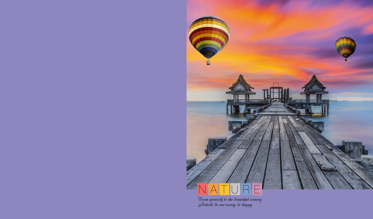 1. Wooden bridge to Djittabhawan Temple in Thailand at sunset on a violet backdrop 2. Sea rocks under a gazebo on a wooden pier at sunset on pastel red-pink backdrop 3. Wooden jetty with gazebo in the light of a sunset on a pink backdrop 4. Wooden pier under scattered storm clouds on light yellow backdrop 5. Wooden beach pier and a gazebo at sunset on pastel teal backdrop