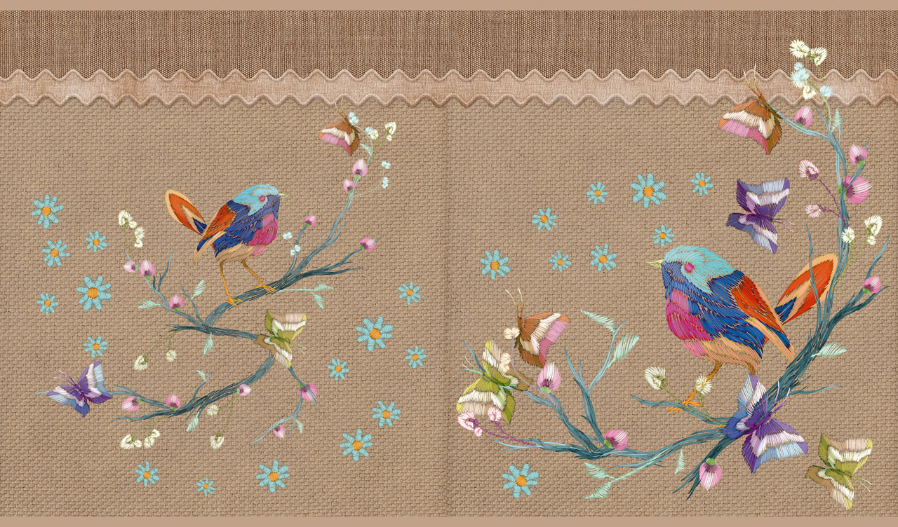 1. Flowers, blue head birds, and butterflies embroidered on beige textured fabric 2. Flowers, teal hummingbirds, and butterflies embroidered on beige textured fabric 3. Flowers, red canaries, and butterflies embroidered on beige textured fabric 4. Flowers, red and teal birds and butterflies embroidered on beige textured fabric 5. Red flowers, colorful birds and butterflies embroidered on beige textured fabric