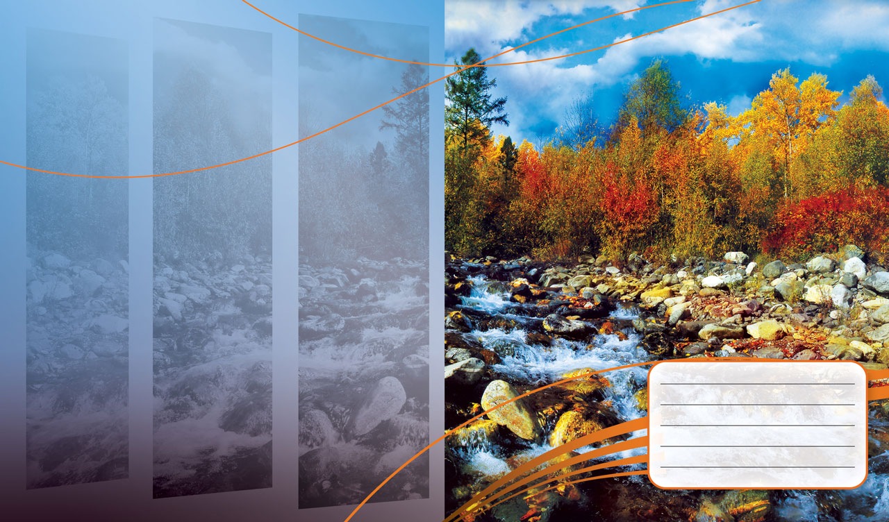 1. Rocky creek in the red and orange forest with blue vertical monochrome panes 2. Blue pond in a coniferous forest with light green vertical monochrome panes 3. Rocky waterfall in a forest overgrown with green grass with vertical faded panels 4. White birch on a grassy river shore under cloudy sky with faded panes