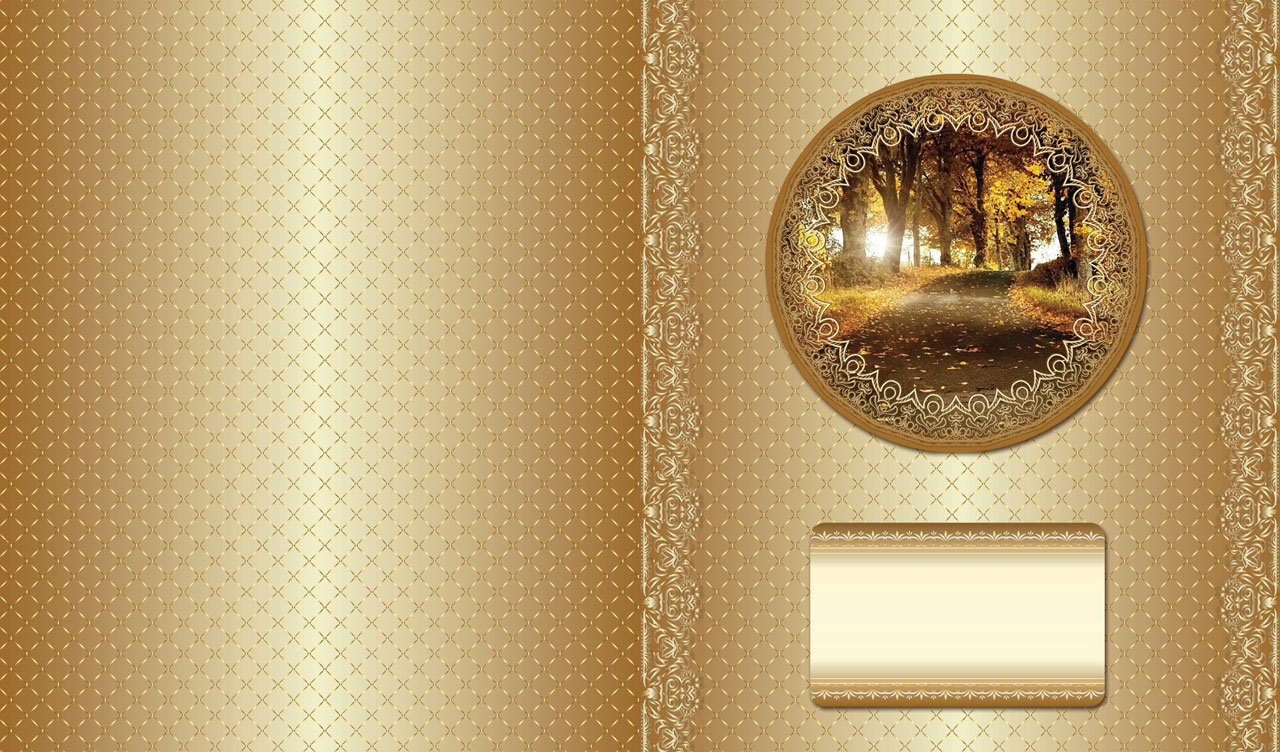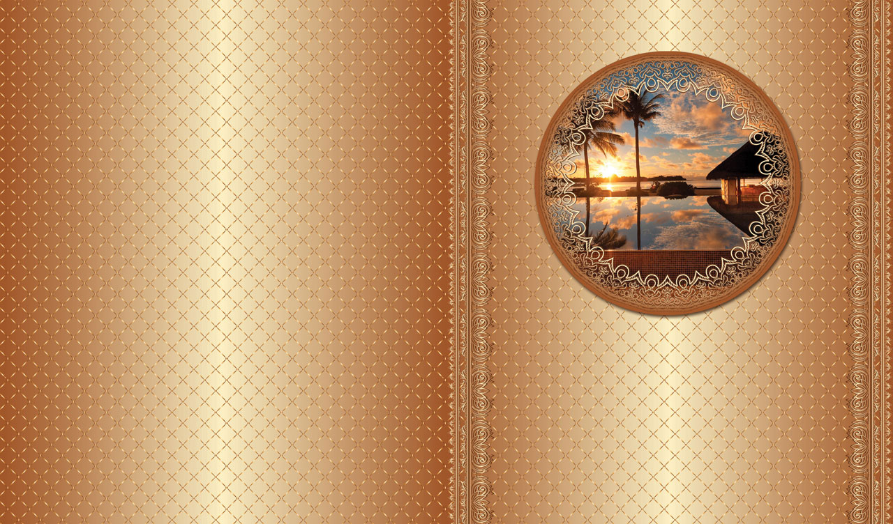 1. Ocean waves at sunset in a round vintage frame on a golden wallpaper 2. Palms and bungalow at sunset in a round vintage frame on a golden wallpaper 3. Park road in foliage at sunrise in a round vintage frame on a golden wallpaper 4. Dense autumn forest at sunrise in a round vintage frame on a golden wallpaper