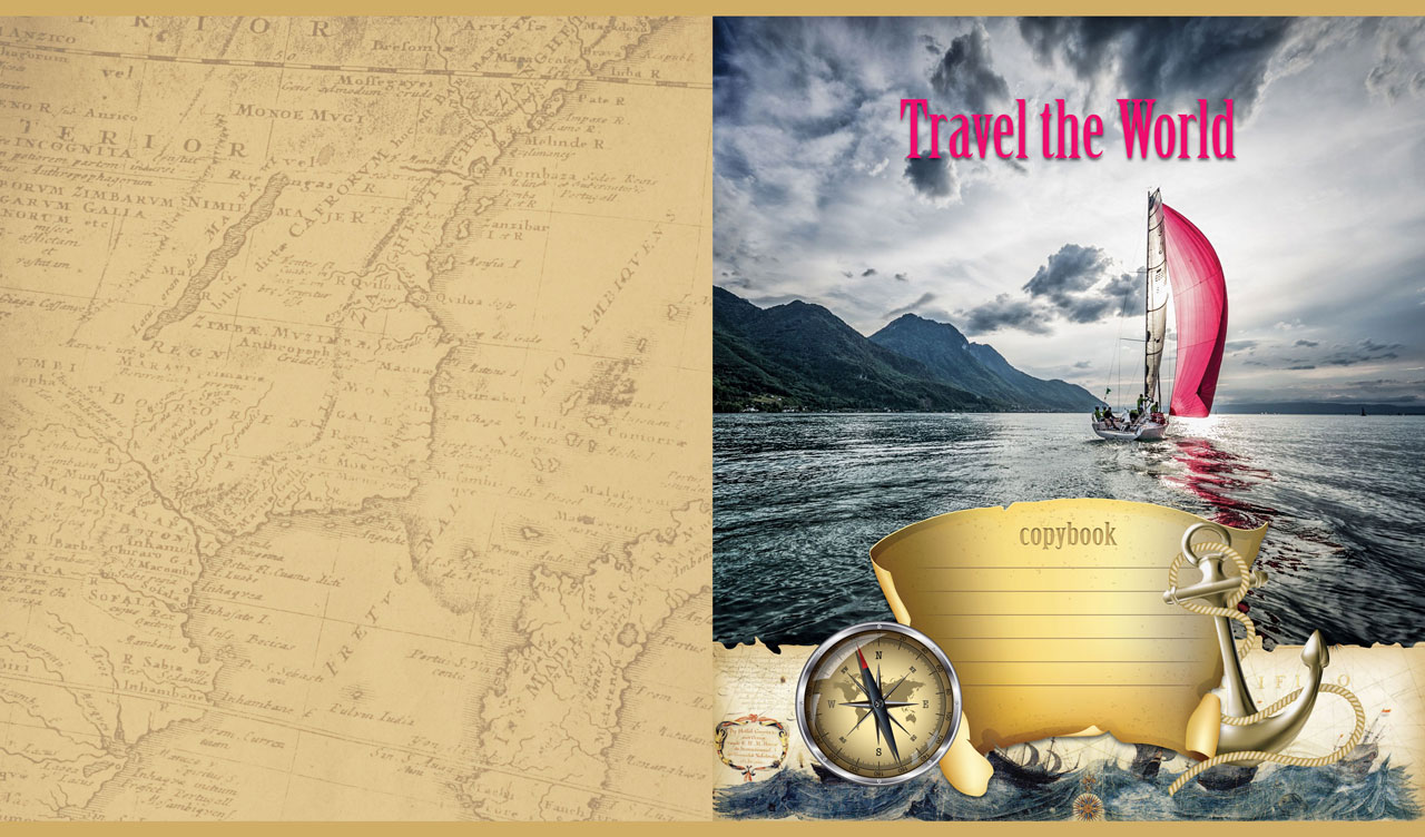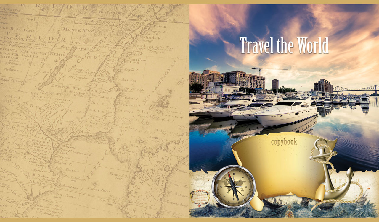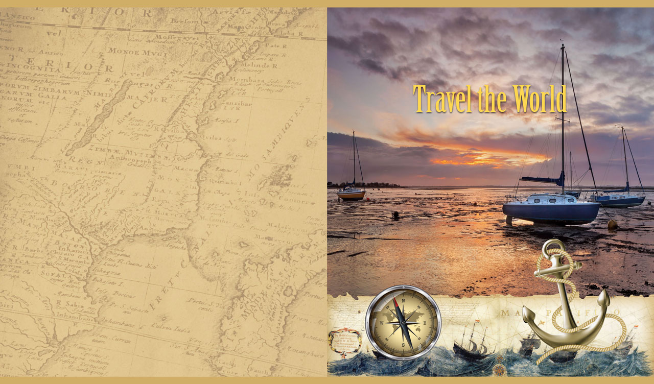 1. Seascape with sailing yachts on tan parchment adorned with an anchor and compass 2. Seascape with sailboats at low tide on tan parchment with an anchor and compass 3. Seascape with yachts at the marina on tan parchment with an anchor and compass 4. Seascape with yachts on grey sky background adorned with anchor and compass