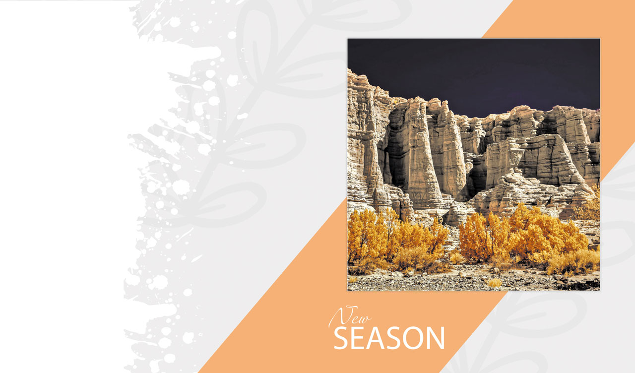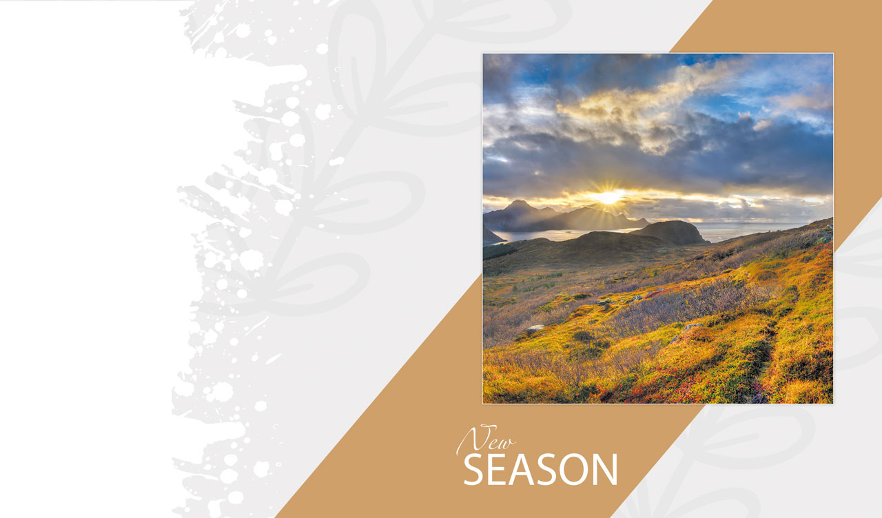 1. Sunset over rocky coastline on a grey backdrop with an ocher oblique panel 2. Rock formation in the moonlight on a grey backdrop with a peach oblique panel 3. Mountain waterscape at sunrise on a grey backdrop with a tan oblique panel 4. Sunset clouds reflected in a river on a grey backdrop with a pink oblique panel 5. Northern Lights in the Arctic sky on a grey backdrop with a navy oblique panel