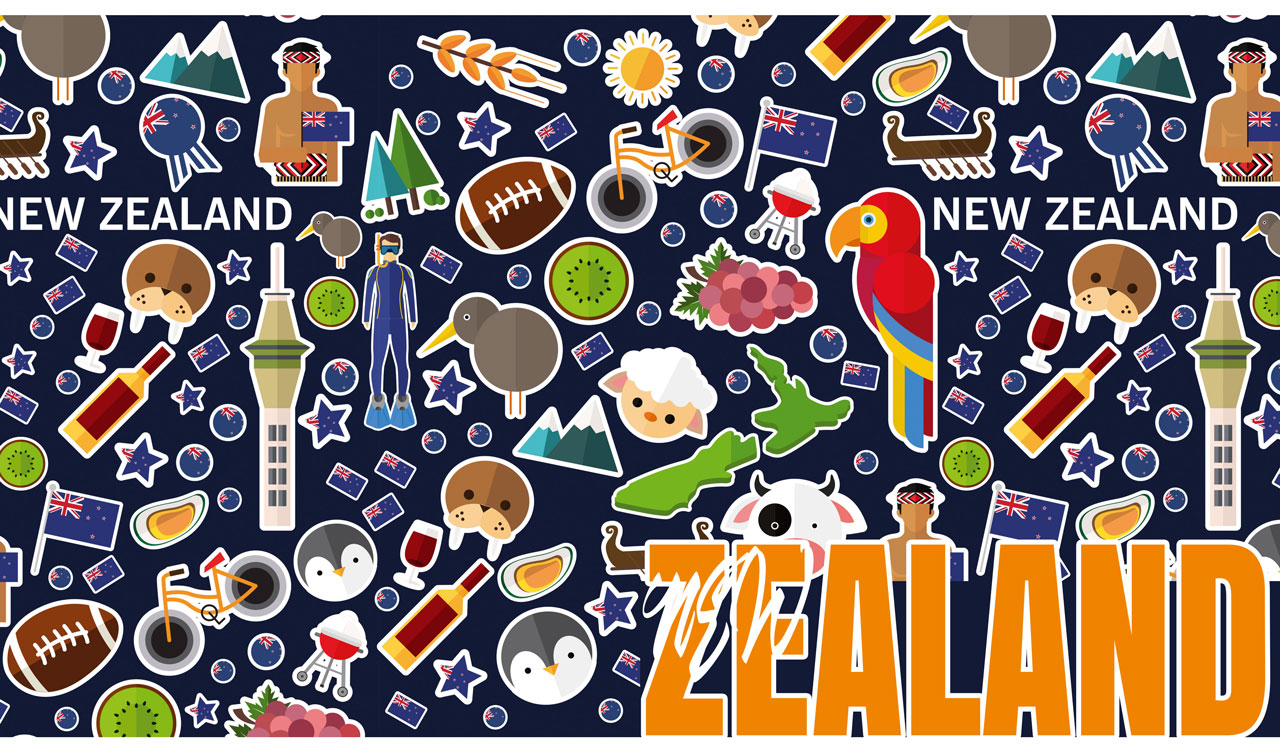 Seamless pattern with symbols and signs of New Zealand, including animals, the national flag and other traditional motifs on navy black.