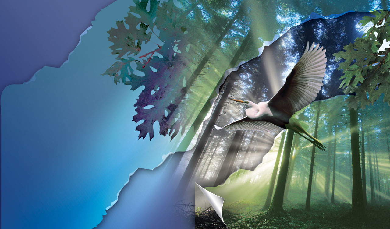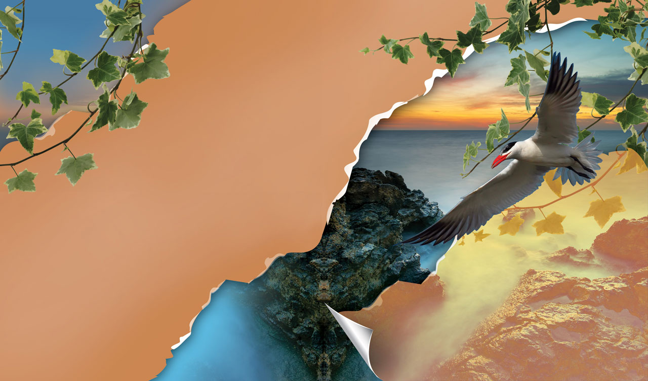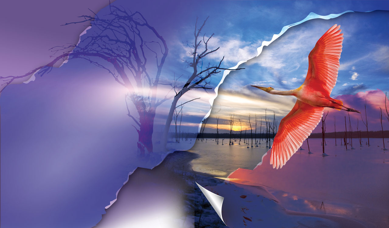 1. Arctic tern flies above the mountains hidden in the blue clouds 2. Great egret flies beneath the forest trees in the rays of the sunrise 3. Roseate spoonbill flies above the frozen lake and bare trees 4. Sand color falcon flies above the green forest and a clear river