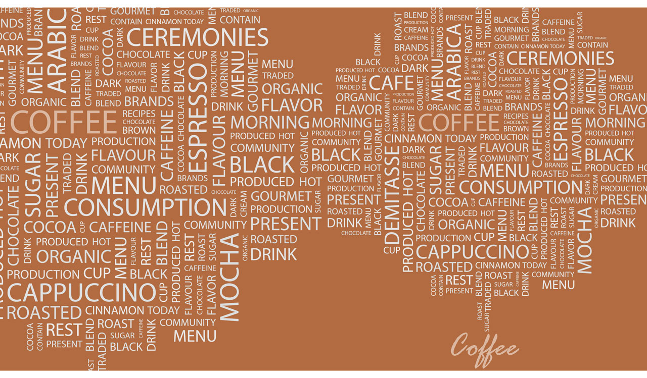Coffee concept wallpaper with a seamless pattern of Ceremonies, Cappuccino and other coffee themed words on an ocher background.