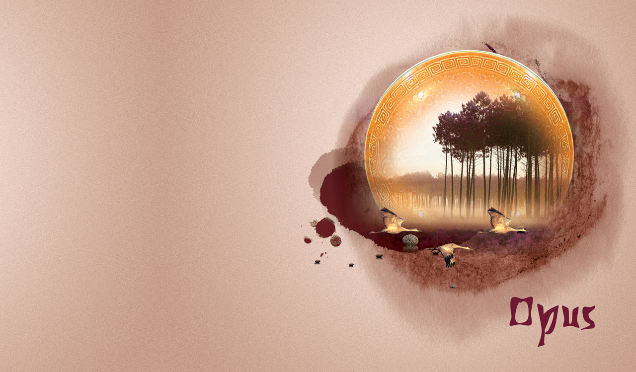 2. Three beige birds fly across the landscape of a forest and a golden greek sphere