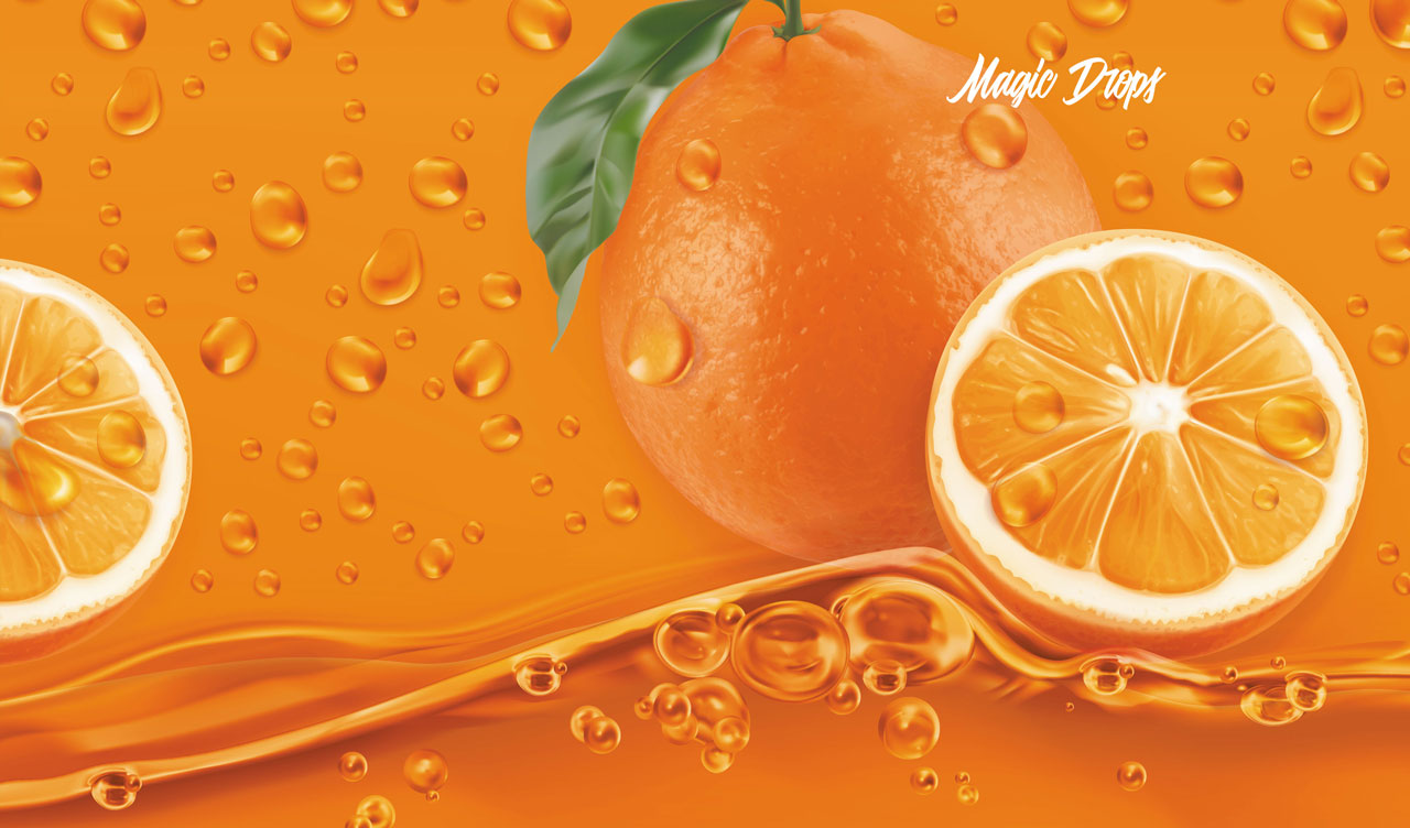 An illustration of juicy oranges in water splashes on an orange backdrop adorned with abstract water droplets.
