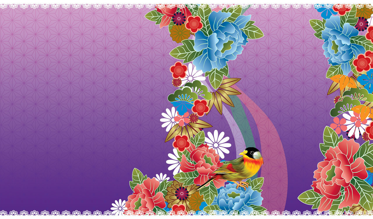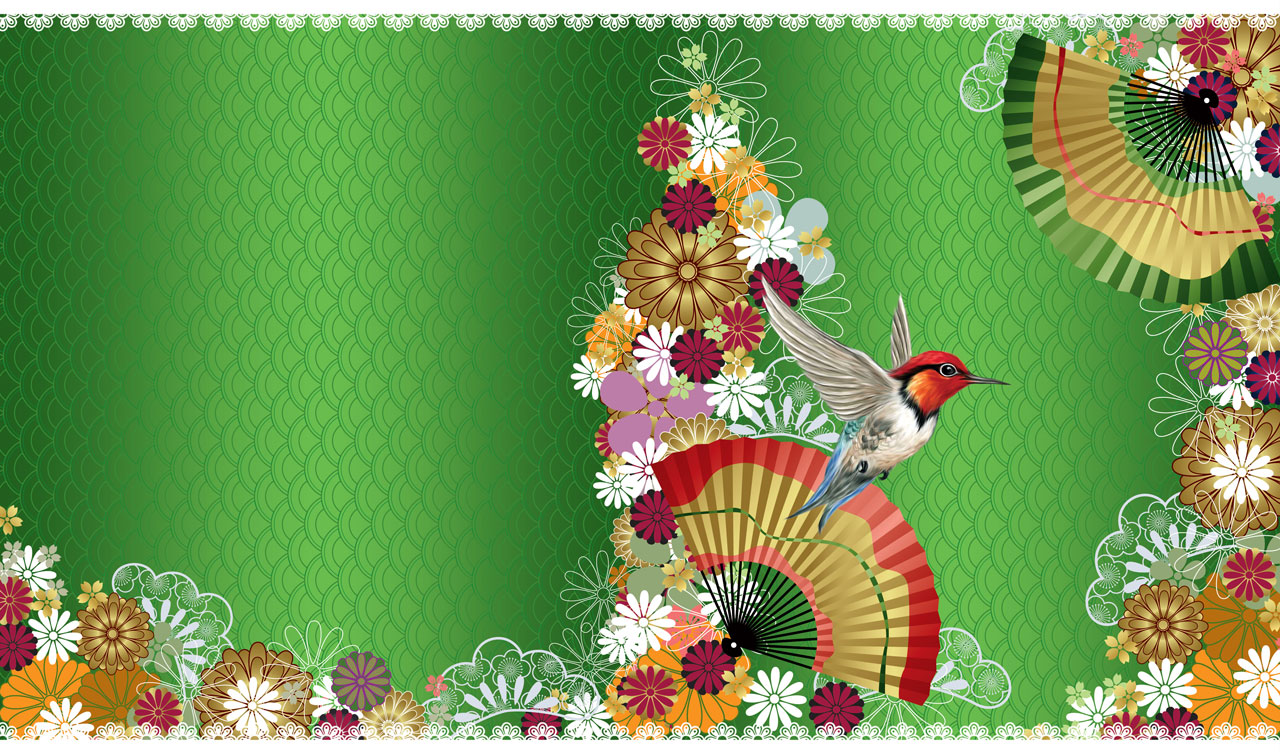 1. Flycatcher on a red tapestry background, embellished with oriental motifs 2. Silver-eared mesia on a purple tapestry background, adorned with oriental motifs 3. Red-winged laughingthrush on a blue tapestry background with oriental motifs 4. Hummingbird on a green tapestry background, embellished with oriental motifs