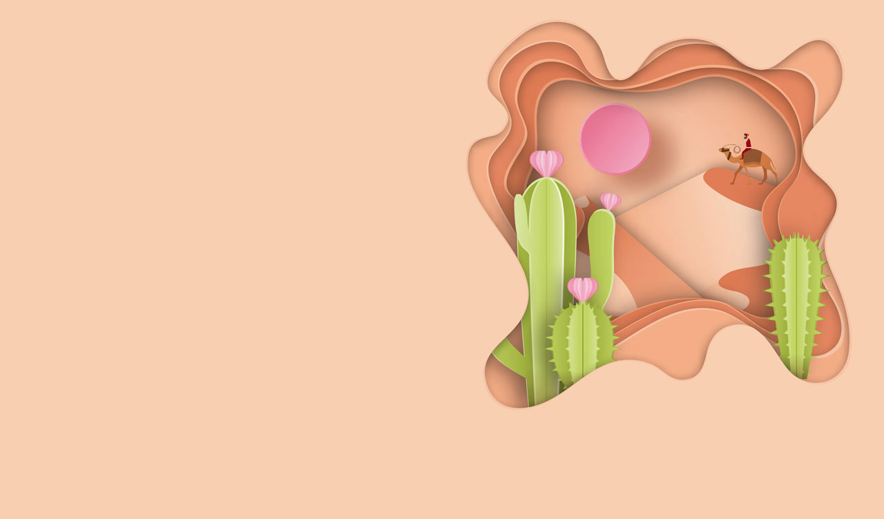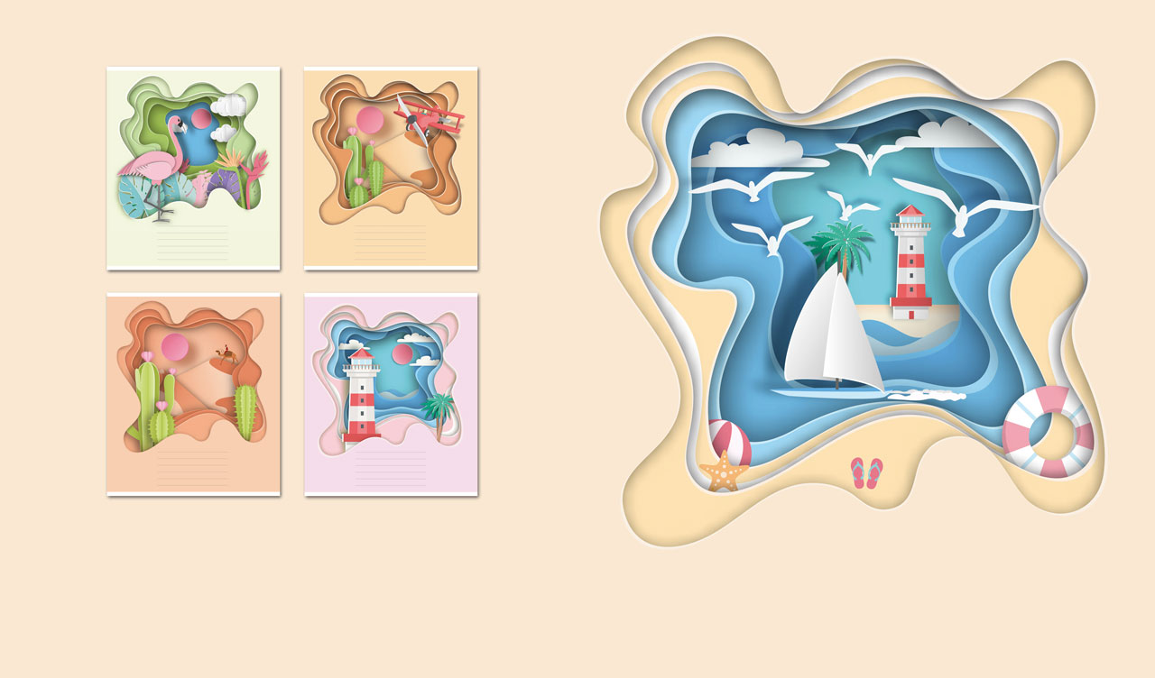 1. Papercut-style miniature scene of a plane in a desert on a yellow-beige backdrop 2. Papercut-style miniature scene of a flamingo in a jungle on a pale lime backdrop 3. Papercut-style miniature scene of a lighthouse by the sea on pale pink backdrop 4. Papercut-style miniature scene of a Bedouin on a camel on gold-beige backdrop 5. Papercut-style miniature of gulls, lighthouse and a sailboat on pale yellow backdrop