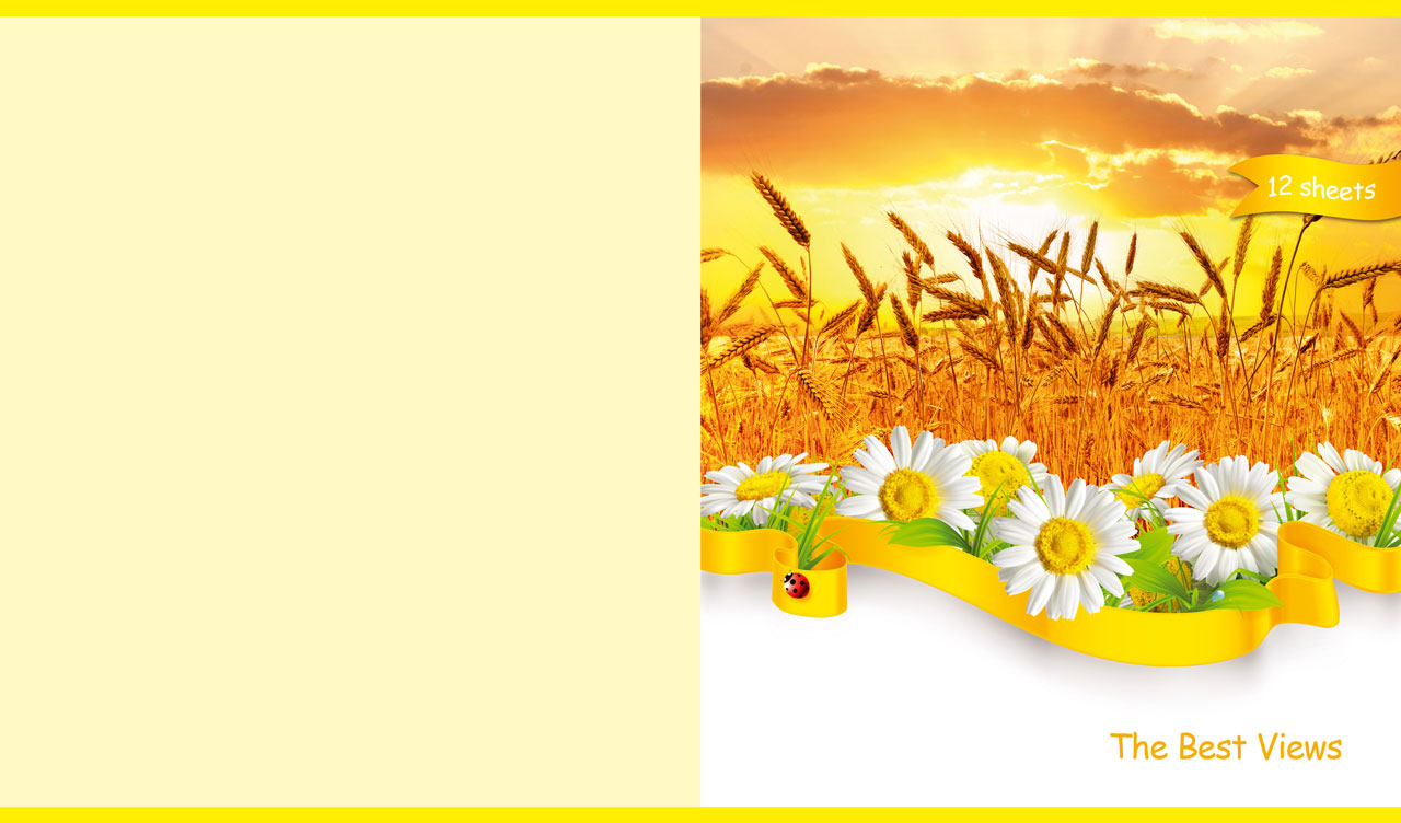 1. Spring Alpine meadow a pastel pink backdrop with a daisy footer 2. Ocean view from a beach cave on a pastel blue backdrop with a daisy footer 3. Spring backwater in a forest on a pastel green backdrop with a daisy footer 4. Field of wheat at sunset on a pastel yellow backdrop with a daisy footer 5. Sunrise over the green vineyards on a pastel beige backdrop with a daisy footer