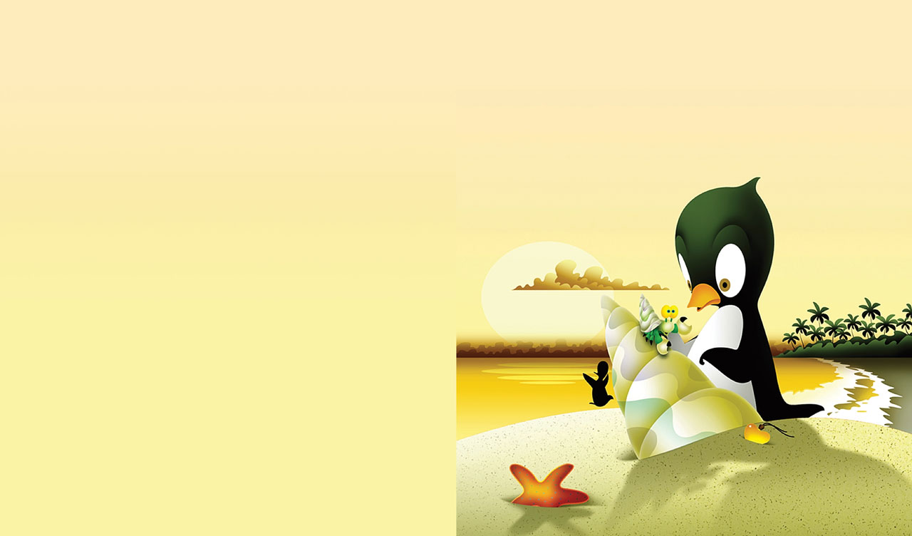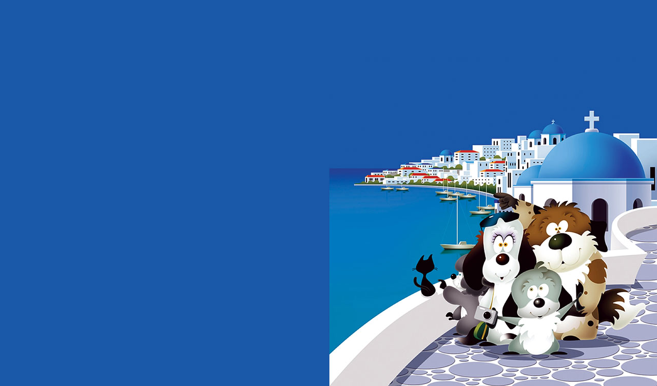 1. Family picture of dogs at a resort against the blue harbor and old seaside town 2. Animated penguin and hermit crab plays with the shells on a beach at sunset 3. Animated penguin in a red hat performs in snowboard competition 4. Animated mysterious cat stands against the yellow moon in the pink sky