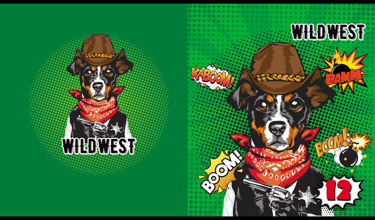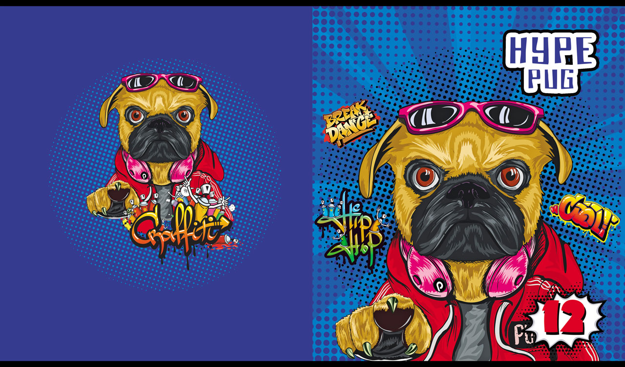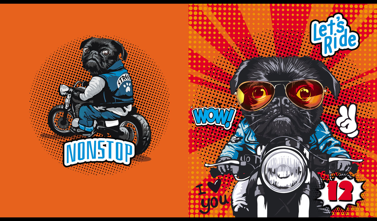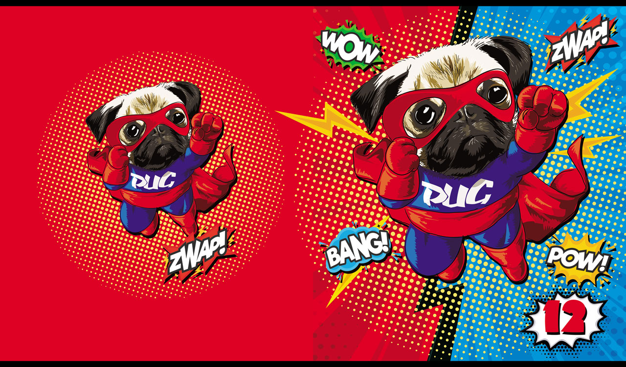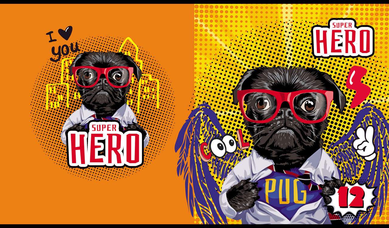 1. An illustration of a superhero pug against a blue and red pop art-style backdrop 2. An illustration of a superhero pug against an orange pop art-style backdrop 3. An illustration of a hip hop pug against a navy blue pop art-style backdrop 4. An illustration of a dachshund sheriff against a green pop art-style backdrop 5. An illustration of a pug biker against an orange pop art-style backdrop