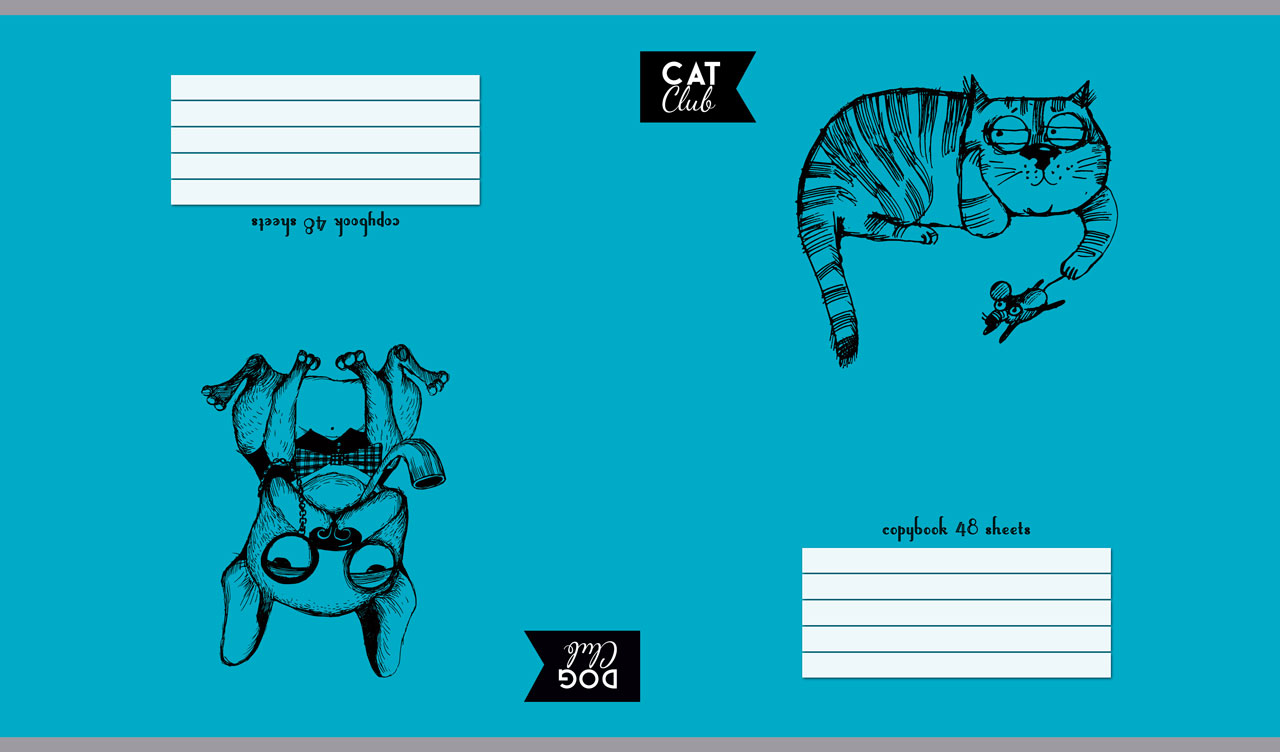 1. Funny cat and a proud owl sketches on a red background 2. Sad dog and a playful owl sketches on an orange background 3. Hilarious dog and a playful cat sketches on a yellow background 4. Lazy cat holds a mouse and a dog with a monocle on a blue background 5. Wise owl and a terrified dog sketches on a fuchsia background