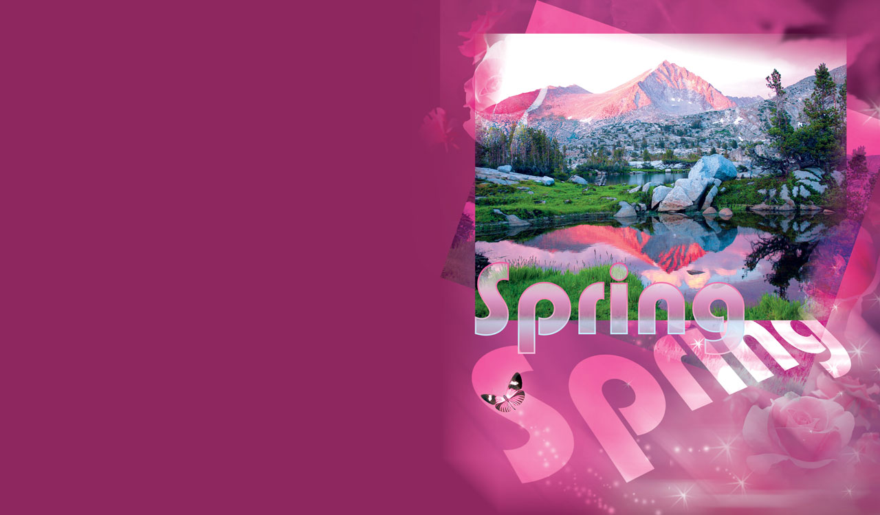 4. Summer mountain lake with green grass, red rocks, leaves and butterfly on green
