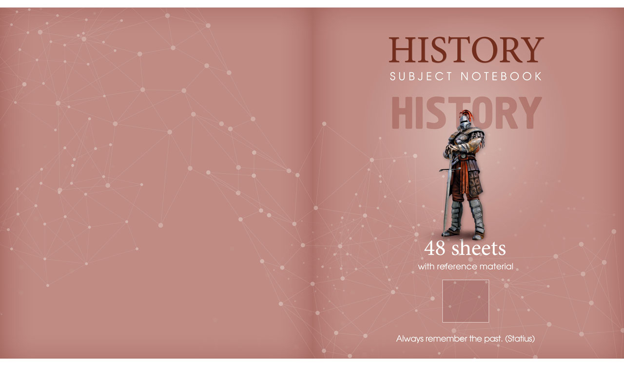 History notebook with a medieval knight and a quote by Statius on a pink-brown background with a seamless network pattern.
