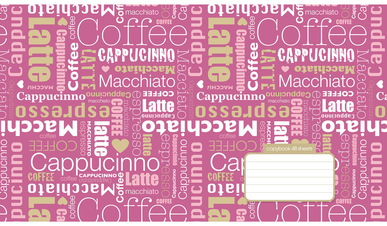 Coffee concept wallpaper with a seamless pattern of Latte macchiato, Cappuccino and other coffee themed words on a pink background.
