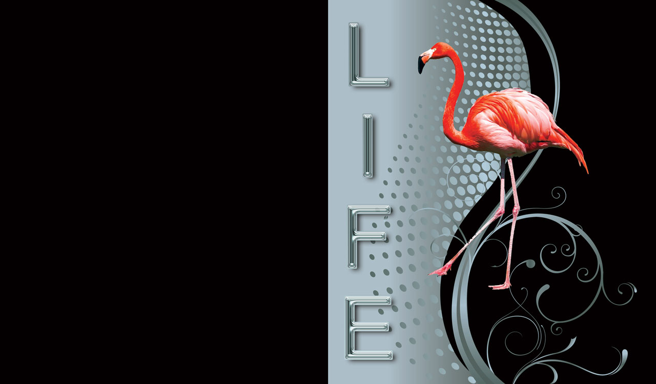 Full-length, pink flamingo on a steel grey wallpaper covered with metallic dots and silver swirls on a black background.